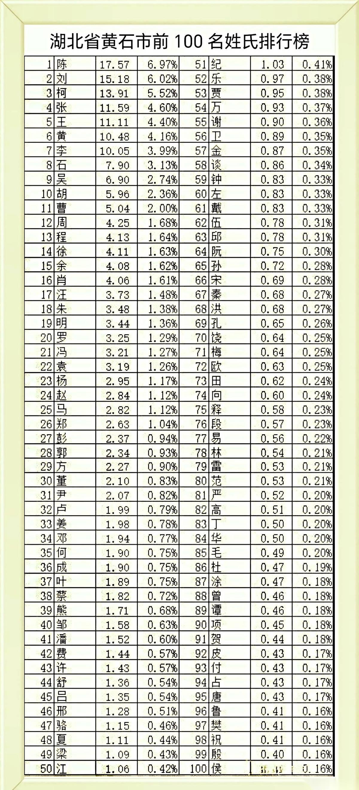 “你姓啥?”黄石人一开口,可能直接就揭了自家底!这刚出炉的“黄石百家姓”,前五名一亮出来,直接让人拍大腿。 李、王、张、刘、陈。这几个姓,简直是黄石的“扛把子”!你往前翻两页家谱,大概率能跟他们沾亲带故。 有人盯着榜单,眉头一挑,脱口而出:“我姓黄,结果连前五都挤不进去?”言语里透着一股不服气。 这100个姓,就像一张巨大的家庭合影,每个名字背后,都藏着黄石这座城市的“基因密码”。你的姓氏在这张榜上吗?排第几?