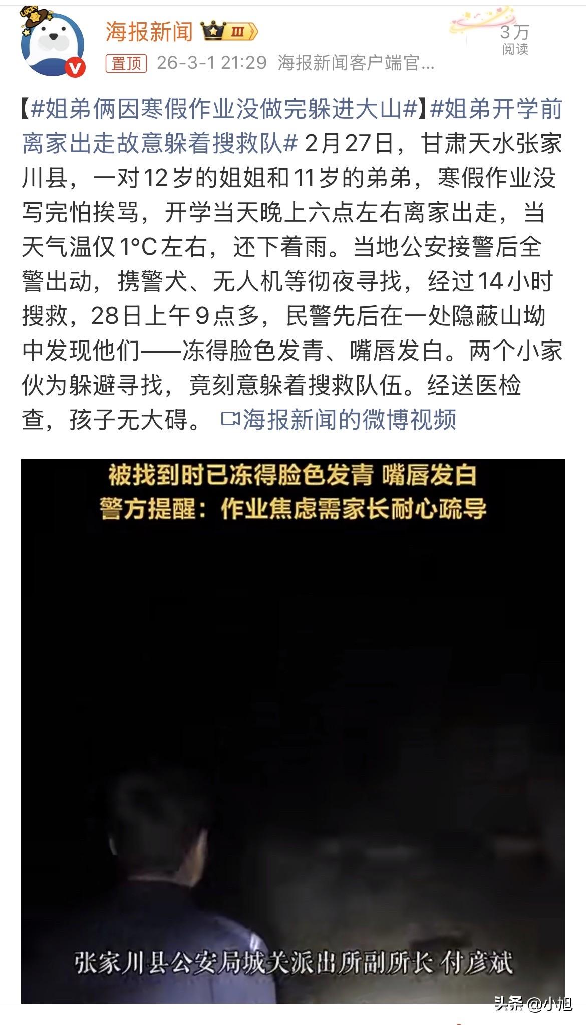 真的破防了!2月27号晚上六点,甘肃天水张家川县,一个12岁的女孩拉着11岁的弟弟,一头扎进了村后的大山里。 那天晚上,山里的气温只有1度左右,天上还下着雨。 两个孩子就这么消失了。 家里人急疯了,赶紧报警。当地公安局把能派的人都派出来了,30多个民警,带着警犬,操控着无人机,在大山里找了整整一夜。 警方的搜救力度很大,无人机带着热成像,在天上飞来飞去。按理说,两个孩子躲在草丛里或者山坳里,热成像很容易就能发现。 可奇怪的是,无人机飞了好几圈,什么也没看到。 搜救队员在山里喊,用手电筒照,折腾到后半夜,还是没找到人。 事情到这里,开始有点不对劲了。 直到第二天上午九点多,搜救了14个小时后,民警才在一处特别隐蔽的山坳里找到了他们。 找到的时候,两个孩子的脸冻得发青,嘴唇没有血色,浑身哆嗦。 民警赶紧把外套脱下来裹住他们,送到医院检查,好在人没大事。 可事后警方透露的一个细节,让所有人都倒吸一口凉气。 这两个孩子,是有意躲着搜救队的。 他们听见警笛声,看见无人机的手电光,不仅不往有光的地方跑,反而往更深的草丛里钻,往更隐蔽的地方藏。 大冬天,零度左右的雨夜,两个孩子在山里,为了不被找到,硬是和30多个搜救人员、带着高科技装备的警察,玩了一整夜的捉迷藏。 什么概念。 冬天的山里,没什么吃的,又冷又饿。成年人穿着羽绒服在室外待一个小时都受不了,这两个孩子在山里躲了整整14个小时。 他们宁愿冒着被冻坏的危险,宁愿饿着肚子,宁愿在黑夜里听着不知名的动物叫声害怕,也不愿意回家。 到底怕成什么样,才能让一个孩子做出这种选择。 那天晚上,雨打在脸上是冰的,风吹在身上是刺骨的。姐姐带着弟弟,不知道躲在哪块岩石后面,或者哪个干涸的水沟里。 听见有人喊名字,他们捂住嘴不出声。看见有光扫过来,他们趴在地上不动。 他们是打定主意的,就算冻死在山里,也不能被找到。 一个12岁的女孩,一个11岁的男孩,平时在家里可能就是普通的孩子,会撒娇,会偷懒,会因为作业太多发牢骚。 但那天晚上,他们表现出的那种冷静和坚决,让人心里发毛。 他们知道搜救的套路,知道人会往哪里找,所以专门挑那些没人会去的地方藏。 一个晚上,他们是怎么熬过来的。 两个孩子紧紧地靠在一起取暖,听着外面的风声雨声,偶尔还有野兽的叫声。他们肯定害怕,但不敢出声,也不敢动。 天亮的时候,看见民警出现在面前,那一刻他们心里想的是什么,是终于得救了,还是完了,还是被找到了。 没人知道。 但可以确定的是,那种对回家的恐惧,压过了对寒冷和黑夜的恐惧。 这种恐惧是从哪来的。 寒假作业没写完,这是一个导火索。但能让两个孩子做出这种极端选择的,绝对不是一本没写完的寒假作业那么简单。 是过去每一次没写完作业时,家里人的那种反应。 是那种让人喘不过气来的责骂,是那种失望的眼神,是那种随时可能爆发的怒气。 两个孩子心里清楚,这次作业又没写完,回去之后会发生什么。 那些画面在他们脑子里过了无数遍,越想越怕,最后怕到觉得,还不如去山里躲着。 在他们那个年纪的理解里,山里的冷,山里的黑,山里的未知,都比不上回家要面对的那些东西可怕。 这是一种什么样的家庭日常,才能把一个孩子逼到这个份上。 30多个警察,警犬无人机,找了14个小时,最后找到的是两个差点冻僵的孩子。 这14个小时里,孩子在山里躲,家人在家里等,警察在山里找。 每一分钟对所有人都是煎熬。 可对那两个孩子来说,这种煎熬,竟然比回家还要好受一点。 还好人没事,送医检查后没有大碍。 但身体没事,心里那道坎还在。 这件事不能就这么翻篇了。作业没写完,该不该管,该。但怎么管,管到什么程度,得有个分寸。 如果孩子怕你,怕到宁愿去山里冻一夜都不敢回家,那就不是教育的问题了。 家是什么地方,是最后的退路,是最安全的港湾。 要是家都回不去了,孩子还能去哪。 这回是躲在山里,被找到了。下回呢,要是没找到呢,要是跑去更远的地方呢,要是遇到什么危险呢。 两个孩子在雨夜里冻得发抖的时候,肯定也在想,爸爸妈妈会不会来找我,会不会担心我。 他们肯定也在等,等有人找到他们,把他们带回去。 但同时,他们又害怕被找到,害怕回去之后要面对的一切。 这种矛盾,这种挣扎,才是最让人心疼的地方。 还好这次是虚惊一场,孩子平安无事。 但这件事给所有当家长的提了个醒,得让孩子知道,不管犯了什么错,家永远是能回去的地方。 作业没写完,可以补。人要是出了事,补不回来。 这两个孩子在山里躲了一夜,躲的是什么,是恐惧。 能让这种恐惧消失的,不是更严的管教,而是让孩子知道,家里有爱,有包容,有无论什么时候都会接纳他们的怀抱。 这事你们怎么看。
