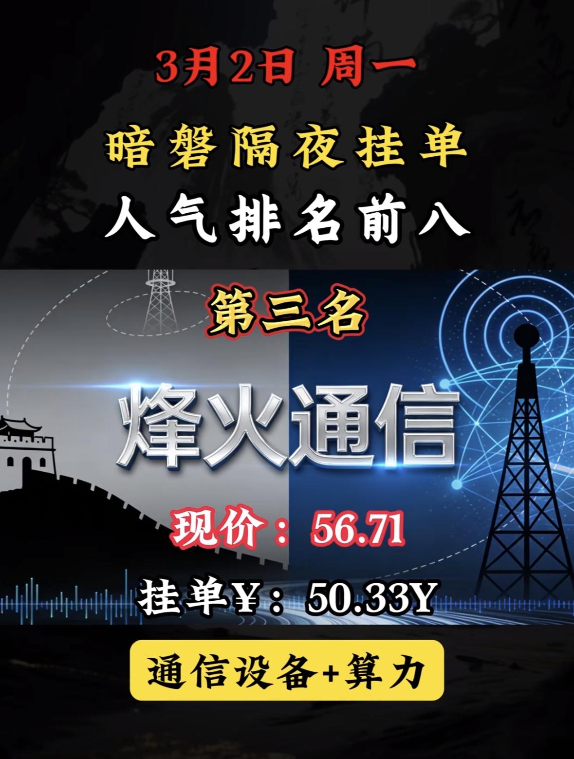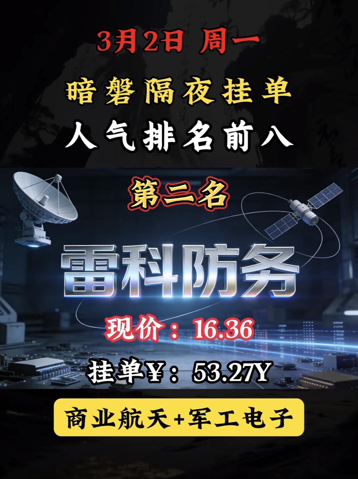 3月3日暗盘隔夜挂单前8名个股梳理"军工航天股雷科登榜暗盘第八,现价稳健,隔