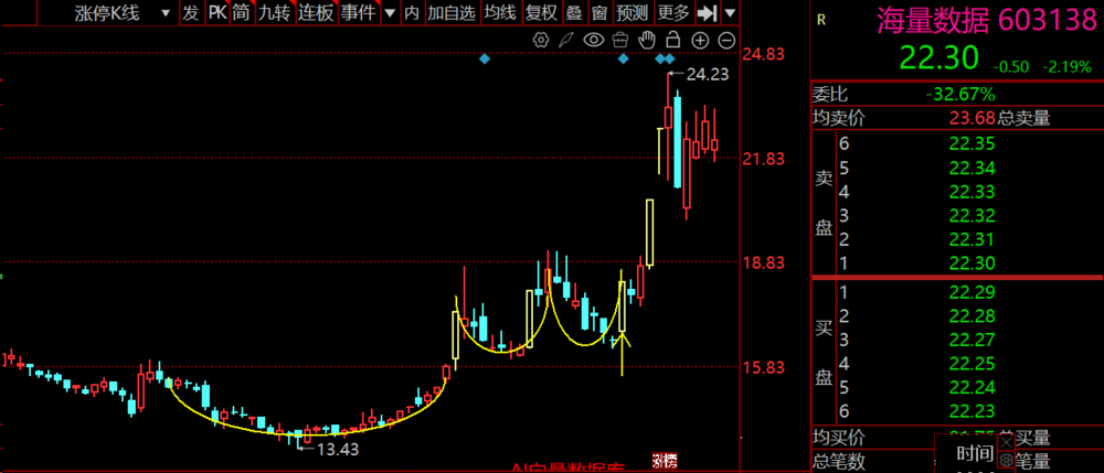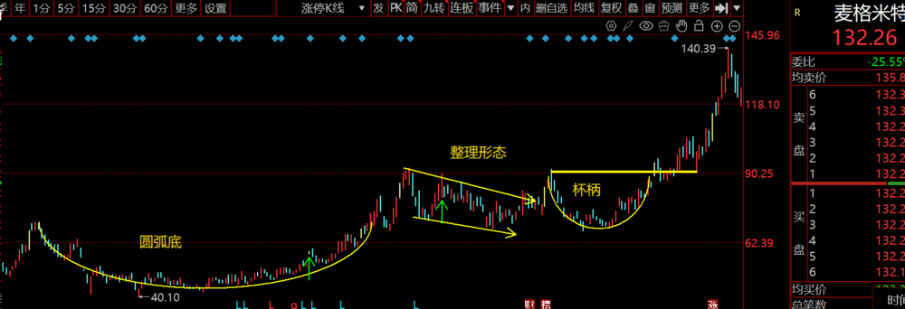 杯柄特征:位于杯口下方,是短暂的回调走势,长度通常为杯身长度的1/3-1/2,回调幅度不宜过大(一般不超过杯口高度的15%),否则形态失效;K线多为小阴小阳,波动幅度小,体现“蓄力”特征。