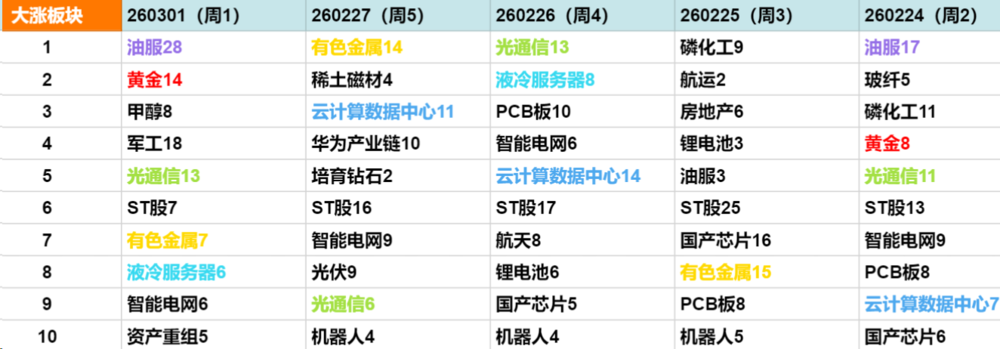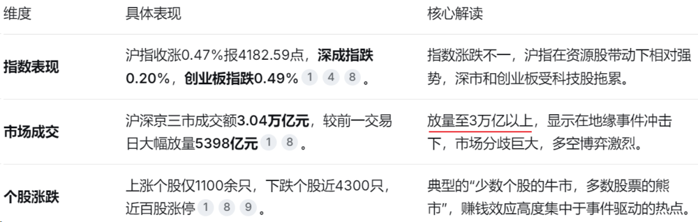 今天市场呈现出显著的结构性分化:油气、黄金等避险资源品全线爆发,而大部分科技股和制造业板块则承压调整。