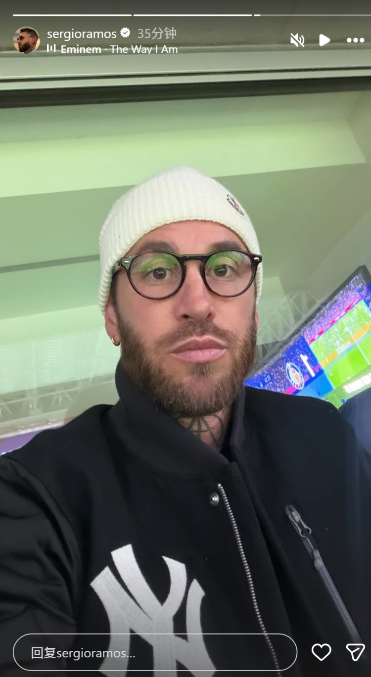 皇马功勋球员拉莫斯回到伯纳乌,现场观看这场比赛,目睹老东家输球,他在社交媒体上晒出观赛照片,这位39岁的后卫表情严肃。