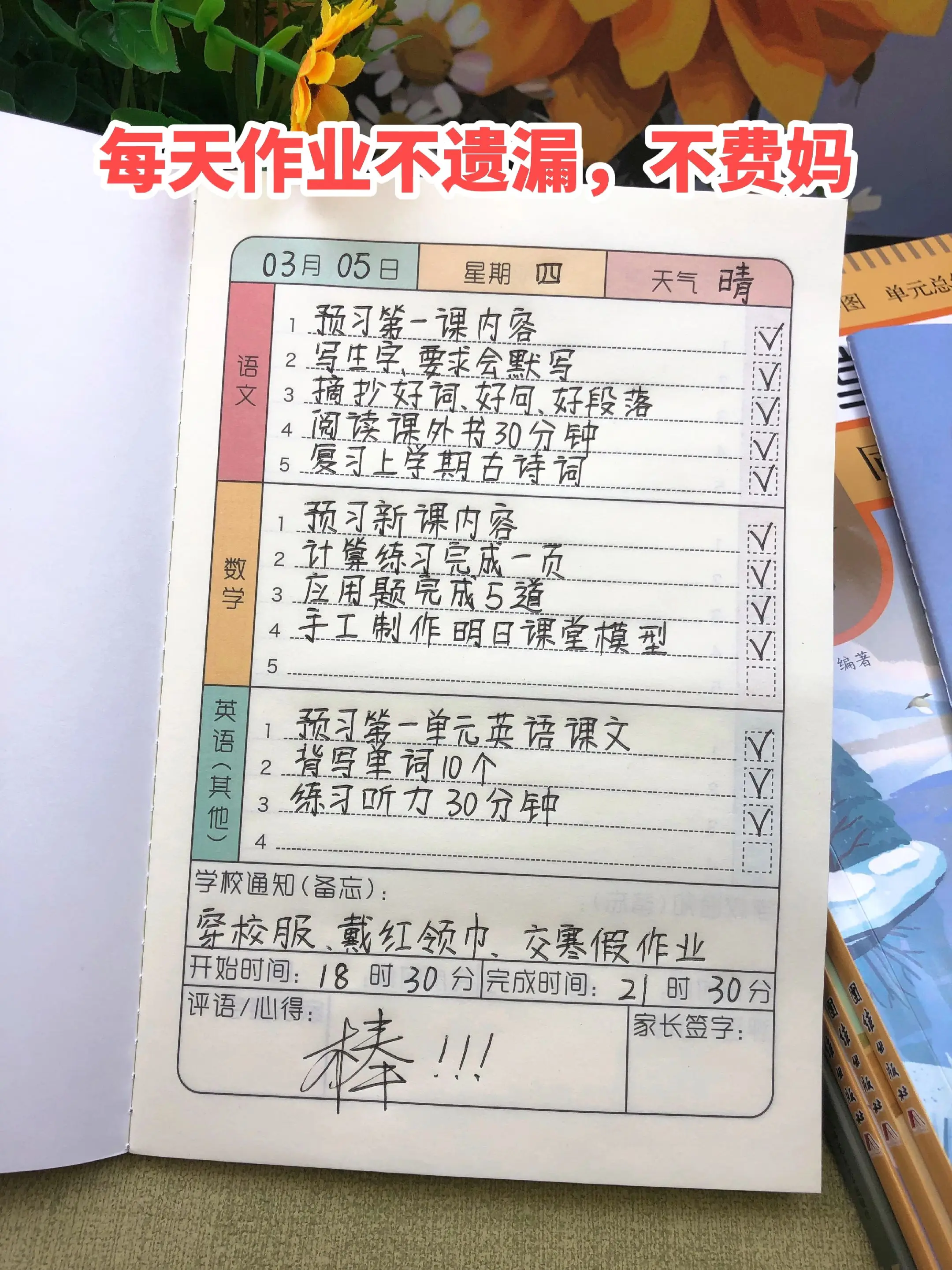 女儿一年级就养成的好习惯,用作业登记本 每天作业从没有遗漏,科目分类清晰明了,始终相信先有好习惯,再有好成绩。