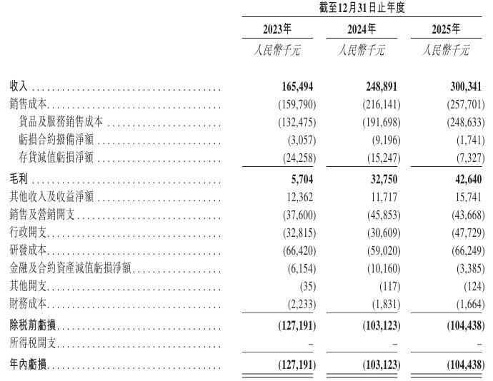 2023年、2024年及2025年,该公司年内亏损分别约为1.27亿元、1.03亿元、1.04亿元人民币。