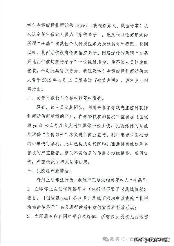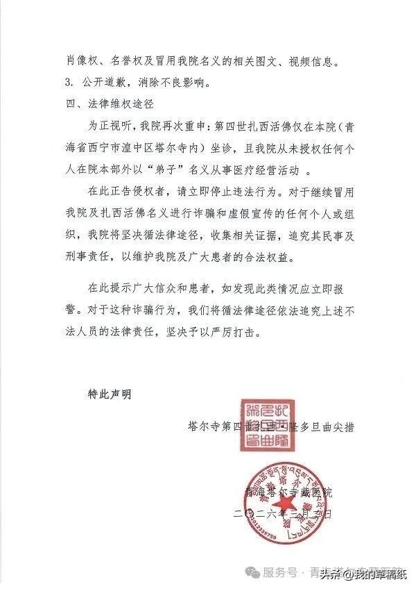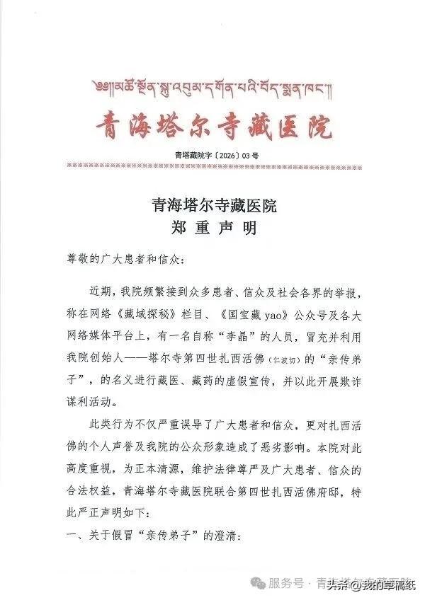 青海塔尔寺藏医院打假称,你刷到的这个“活佛弟子”李晶是假的,扎西活佛没有任何俗家子弟! 最近有人打着“扎西仁波切亲传弟子”的名号,在网上大肆宣传藏医藏药,还自称叫“李晶”。 告诉你个扎心的事实:青海塔尔寺藏医院刚刚发声,说这纯属虚构! 第四世扎西活佛就在塔尔寺内坐诊,人家明确说了——从来没有认定过任何俗家弟子,更没有叫“李晶”的徒弟。 这波操作我直接看呆了:有人趁着去塔尔寺旅游,拍了张朝拜活佛的照片,转身就在网上包装成“活佛亲传弟子”,开始卖药牟利。 就问你怕不怕? 更离谱的是,这些人专门利用患者求医心切的心理,打着活佛旗号搞虚假宣传。塔尔寺藏医院已经怒了,要求立马删除所有侵权内容。 活佛行医只在塔尔寺院内,没有任何“弟子”在外面搞副业。看到类似宣传,建议直接划走。 你遇到过这种打着宗教旗号搞营销的账号吗?评论区聊聊,帮更多人避坑!