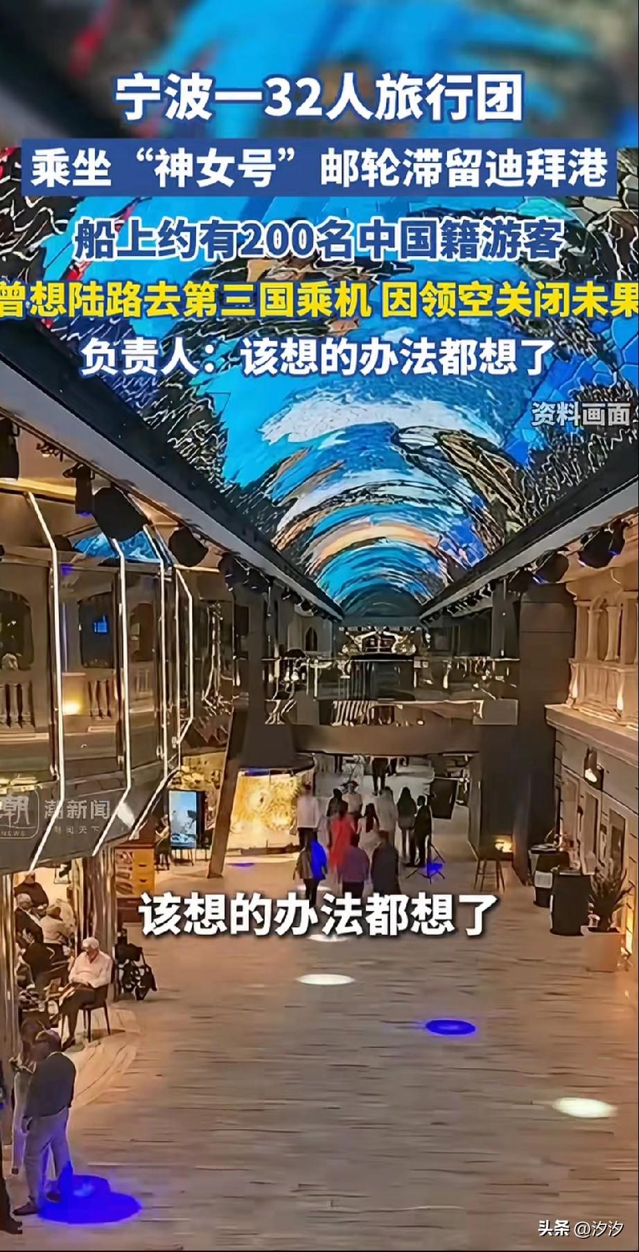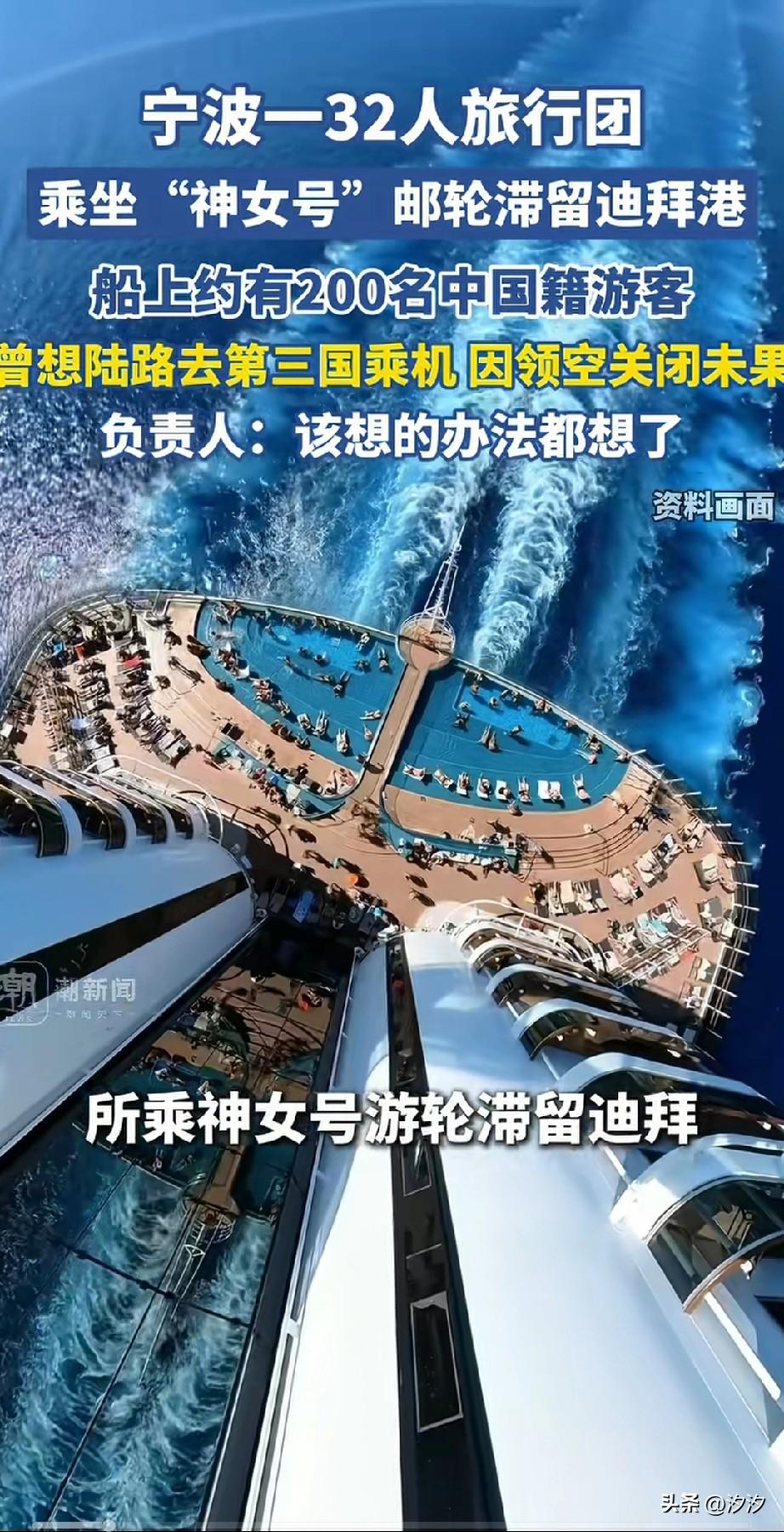 宁波一32人旅行团, 乘坐神女号游轮滞留迪拜港, 船上约有200名中国籍游客, 据悉该有人28号驶离迪拜, 开始8天7晚的旅行, 结果因为中东局势被迫停航, 目前船上设施正常, 物资充足, 外面炮火连天, 船内却宛如天堂, 还真的是一面天堂,一面地狱, 虽然有些担心, 但是好酒,好菜,一顿不少, 该旅行团团长表示, 允许顾客退团并承担损失, 迪拜政府拟承担游客滞留期间的费用, 还提供免费的高速网络, 这些人该想的办法都想了, 曾考虑过陆路前往第三国转机, 但考虑到不安全,放弃了! 还真是有钱人太多了, 这新闻被爆出来之后, 网友的评论都是没想到有钱人这么多! 这些人旅行途中居然见证了历史, 还真的是让人很惊讶! 大家对于这些人的遭遇怎么看? 迪拜观光渡轮 加勒比国际邮轮