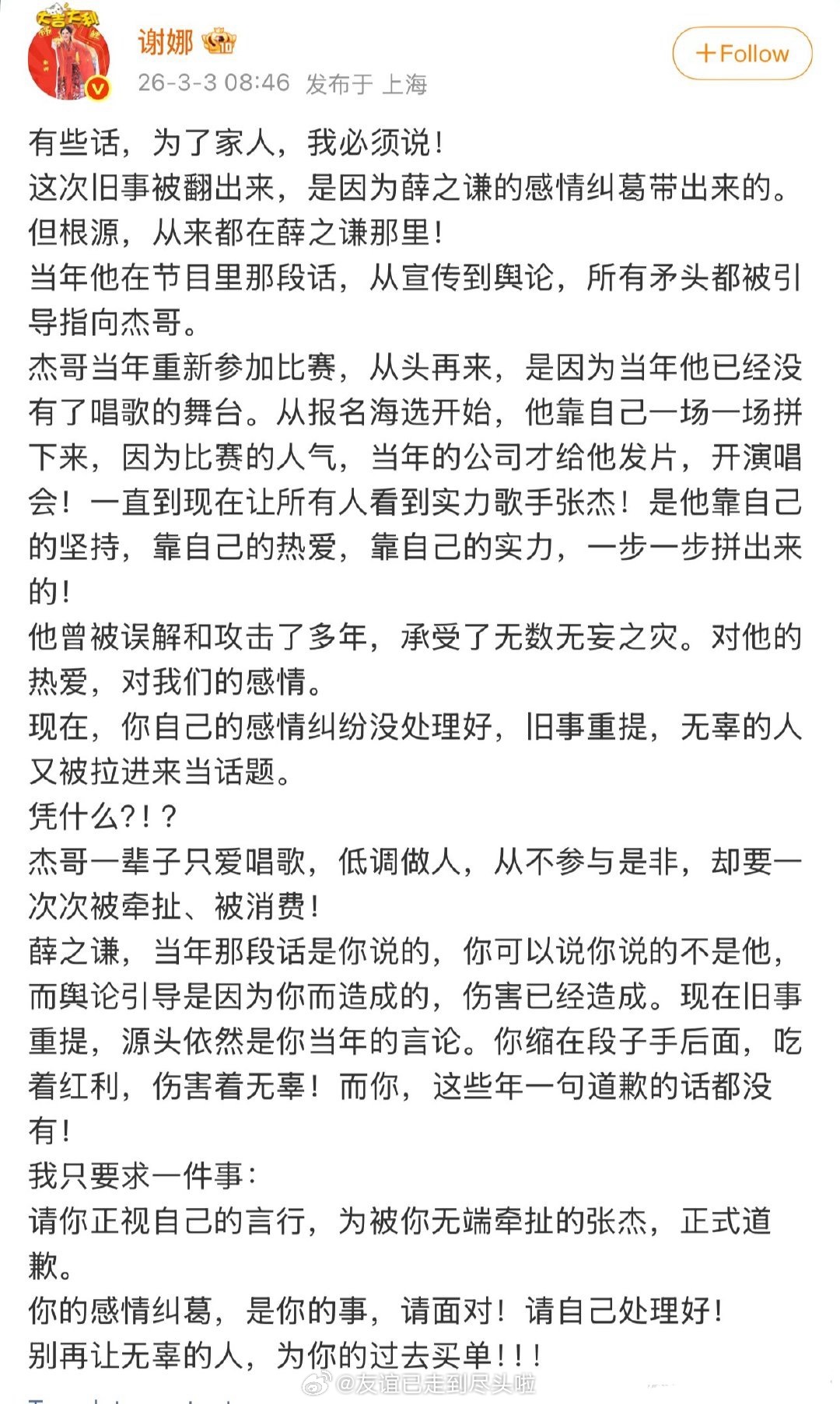 大热闹来了:谢娜直接喊话薛之谦,让他向张杰道歉。主要还是以前的纷争,积怨已久今天爆发了。当时有人猜薛之谦这段吐槽是内涵张杰,不过也有人说是内涵薛另外认识的人事情的导火索,是李雨桐的爆料里提到了张杰,薛之谦之前一直保持沉默,现在谢娜也出来了,应该没办法不回应了吧?谢娜喊话薛之谦薛之谦 张杰薛之谦曾在吐槽大会内涵过张杰