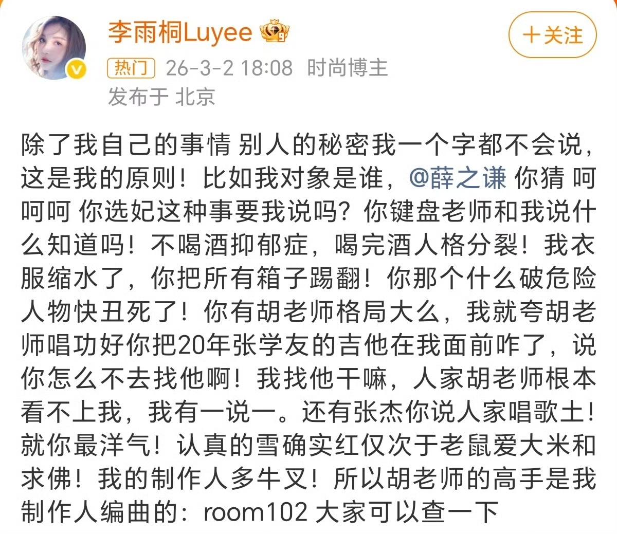 OMG,谢娜发长文直接喊话薛之谦,称张杰因为薛之谦的感情纠葛,旧时被翻出来,一次次被牵扯,被消费!要求薛之谦道歉。 起因是昨天李雨桐爆料中提及薛之谦说张杰的歌土。连带着薛之谦之前在节目上被指内涵张杰的话被翻出来。 17年薛之谦在吐槽大会上说自己作为一个歌手,没有提前解约,不偷不抢,没有找一个有钱的女友给他发片,没有找一个比他红的女友来辅佐他。 疑是内涵张杰。 这下谢娜坐不住了,霸气护夫,称张杰当年重新参加比赛,从头再来,是因为当年他已经没有了唱歌的舞台,“杰哥一辈子只爱唱歌,低调做人,从不参与是非,却要一次次被牵扯、被消费”,并要求薛之谦向张杰道歉。 娜姐牛,指名道姓不含糊,直接下场明明白白开撕!