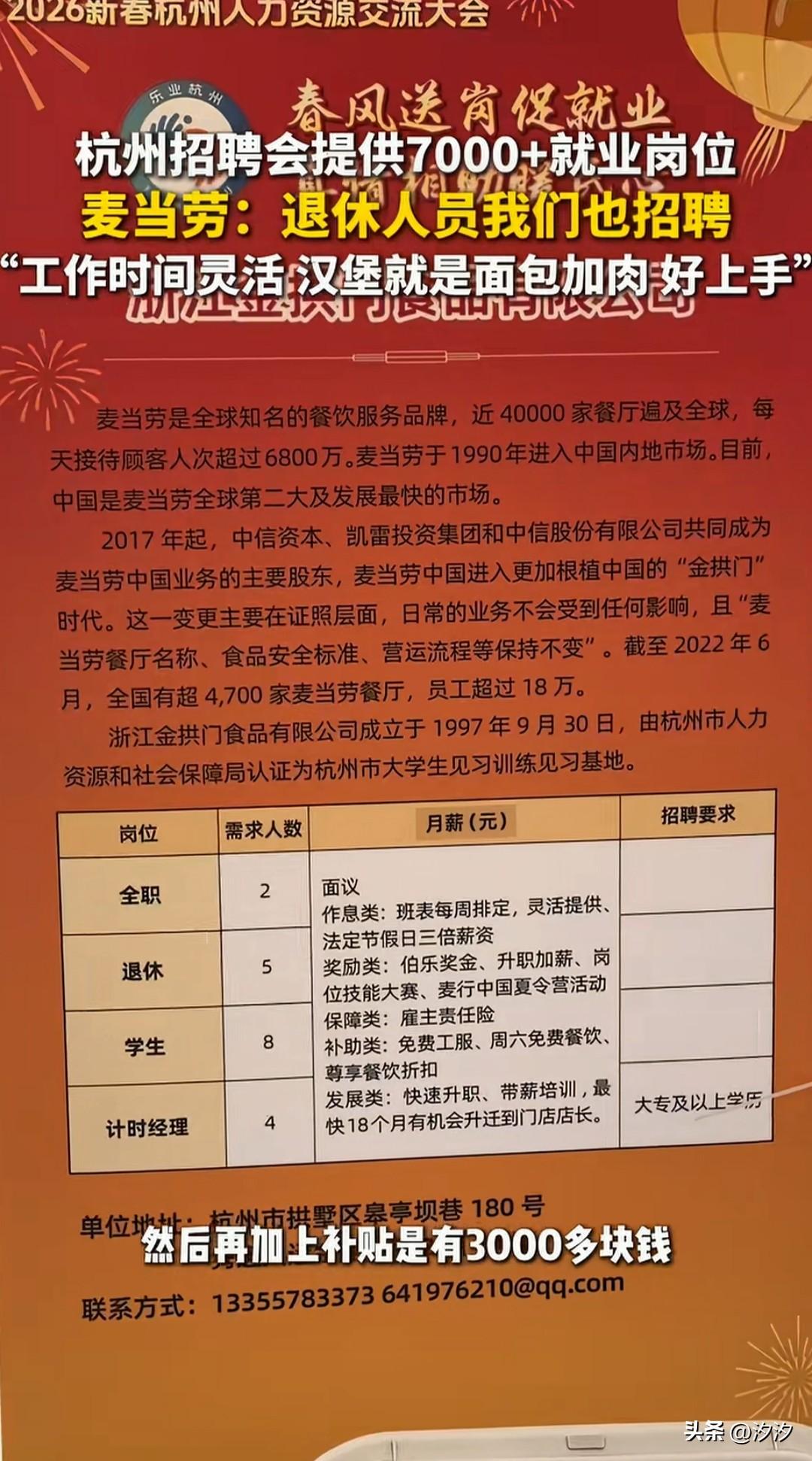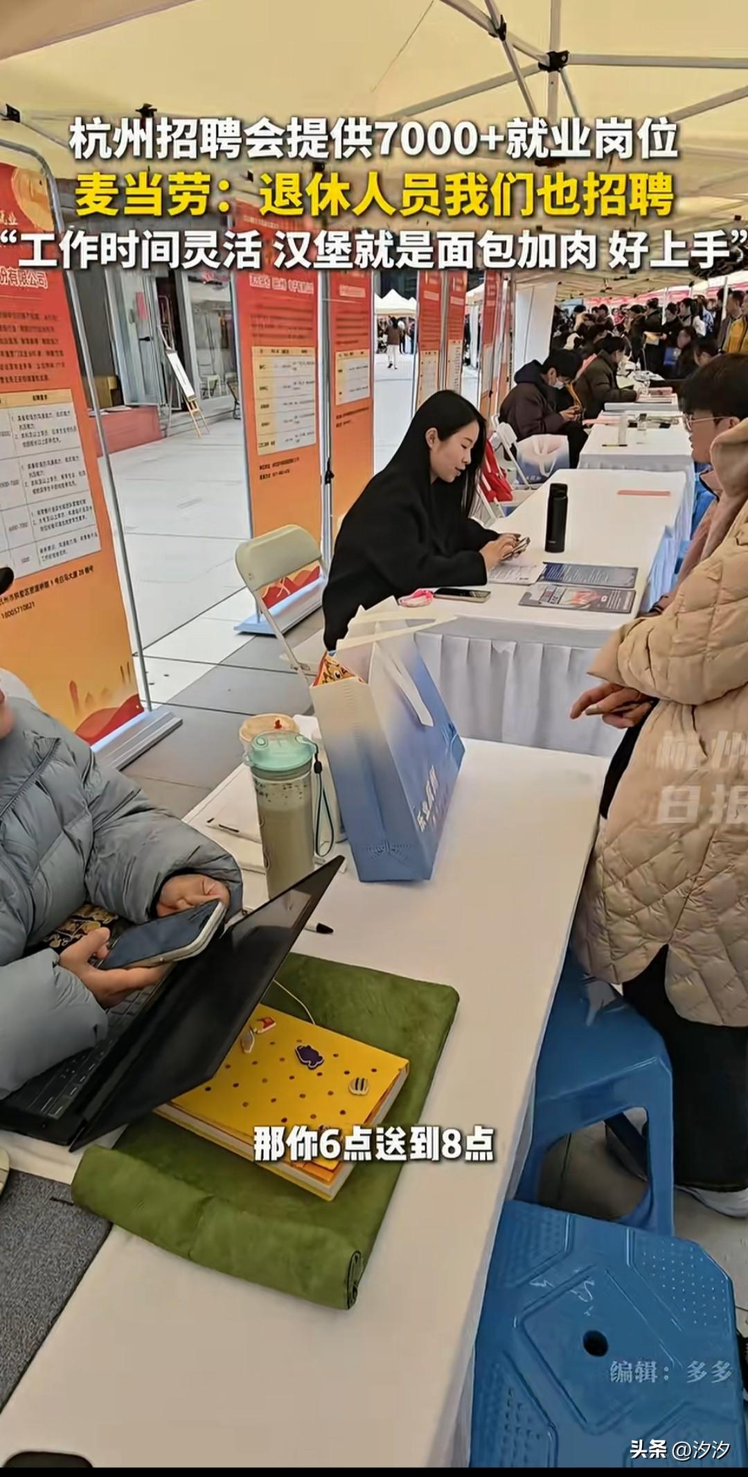 杭州的新春招聘会真的很温度, 麦当劳的招聘小姐姐接受采访, 表示可以招聘退休人员, 让她们发挥余热, 可以,就近安排, 让他们在闲暇时间也可以挣钱, 一个月至少也要2000块, 而且可以就近安排, 而且她们的操作非常简单, 就是面包和肉片, 还说这样会有双重保障, 不影响拿退休金, 这可是退休人员的福利, 退休之后还可再就业, 不像有些企业35岁就不要了, 表示她们不会看年龄, 另外也有很多的招聘岗位, 招聘会提供了7000多个岗位, 这就是杭州线下招聘的温度! 大家觉得杭州是不是一座未来之城? 杭州 杭州工作求职