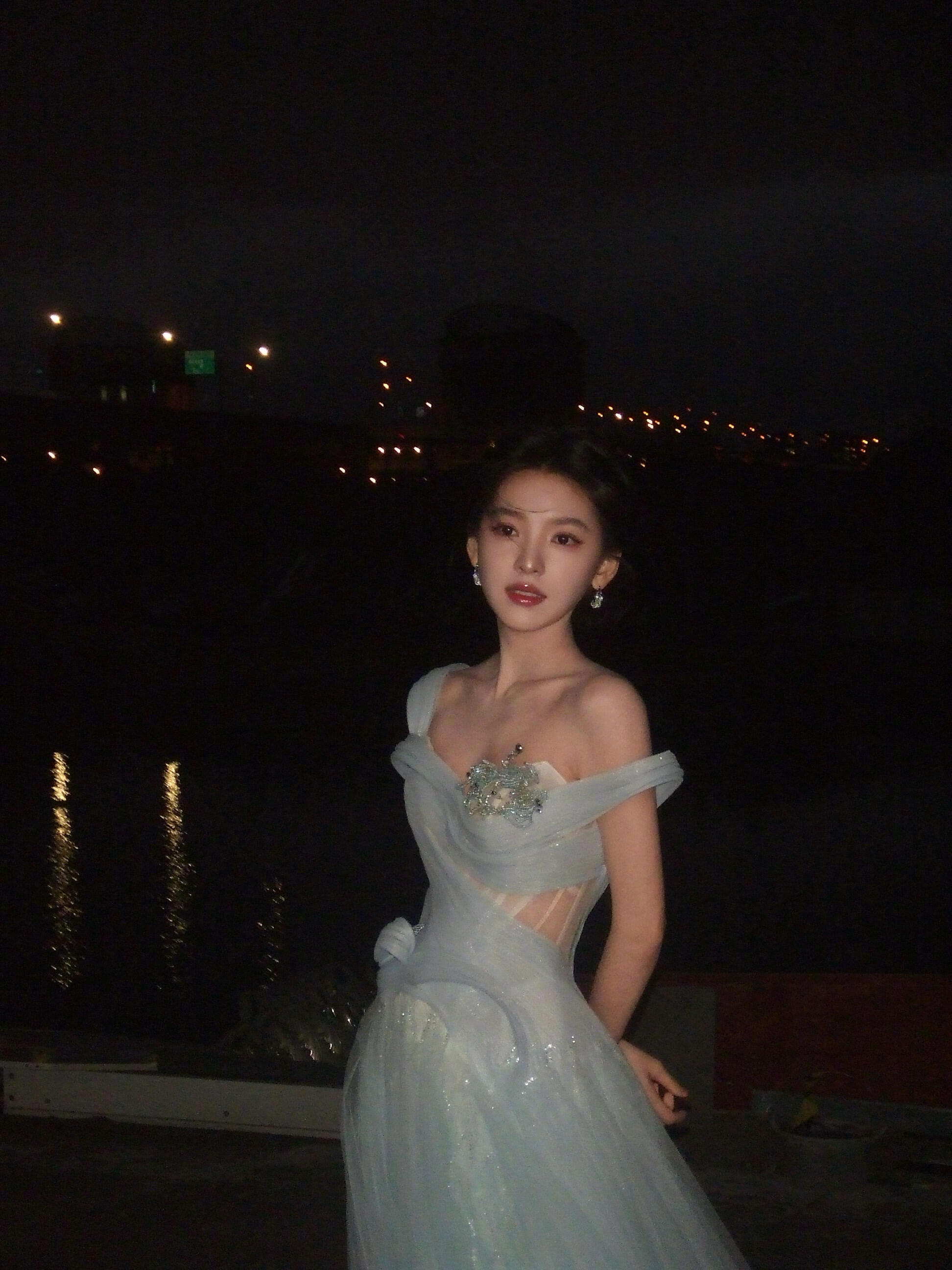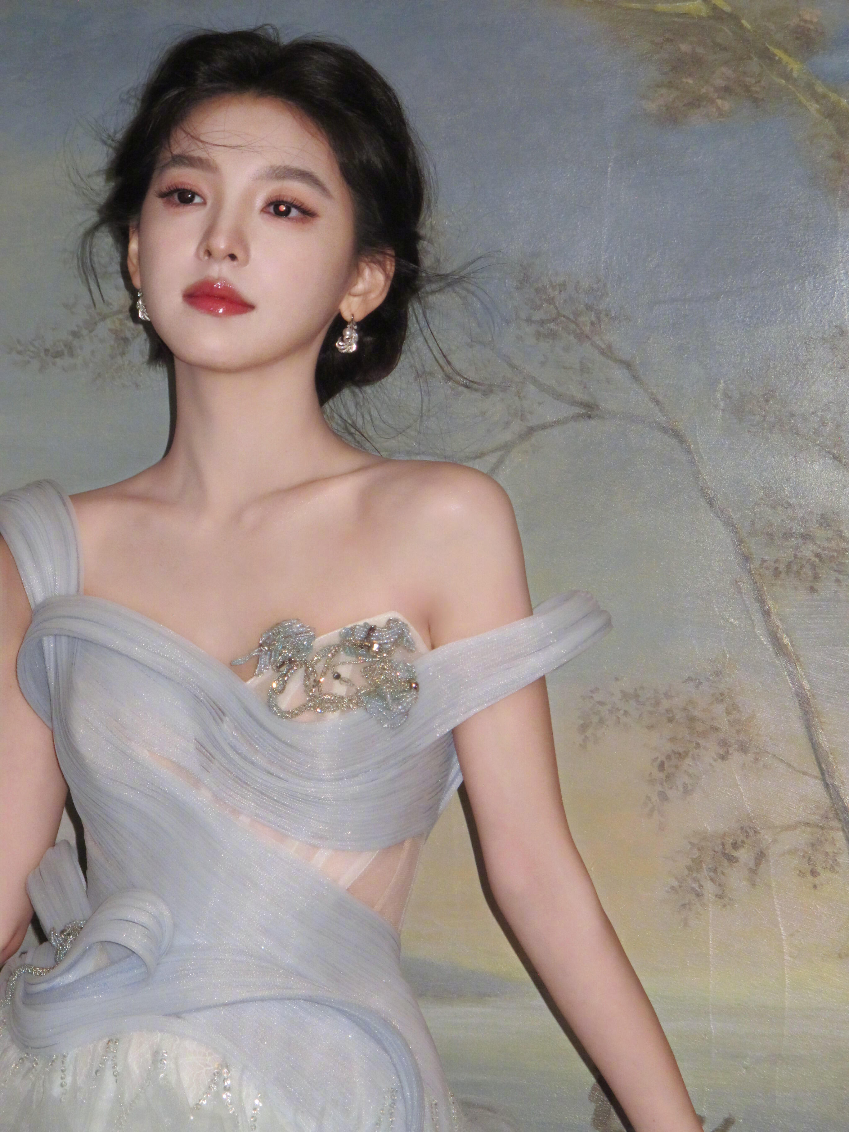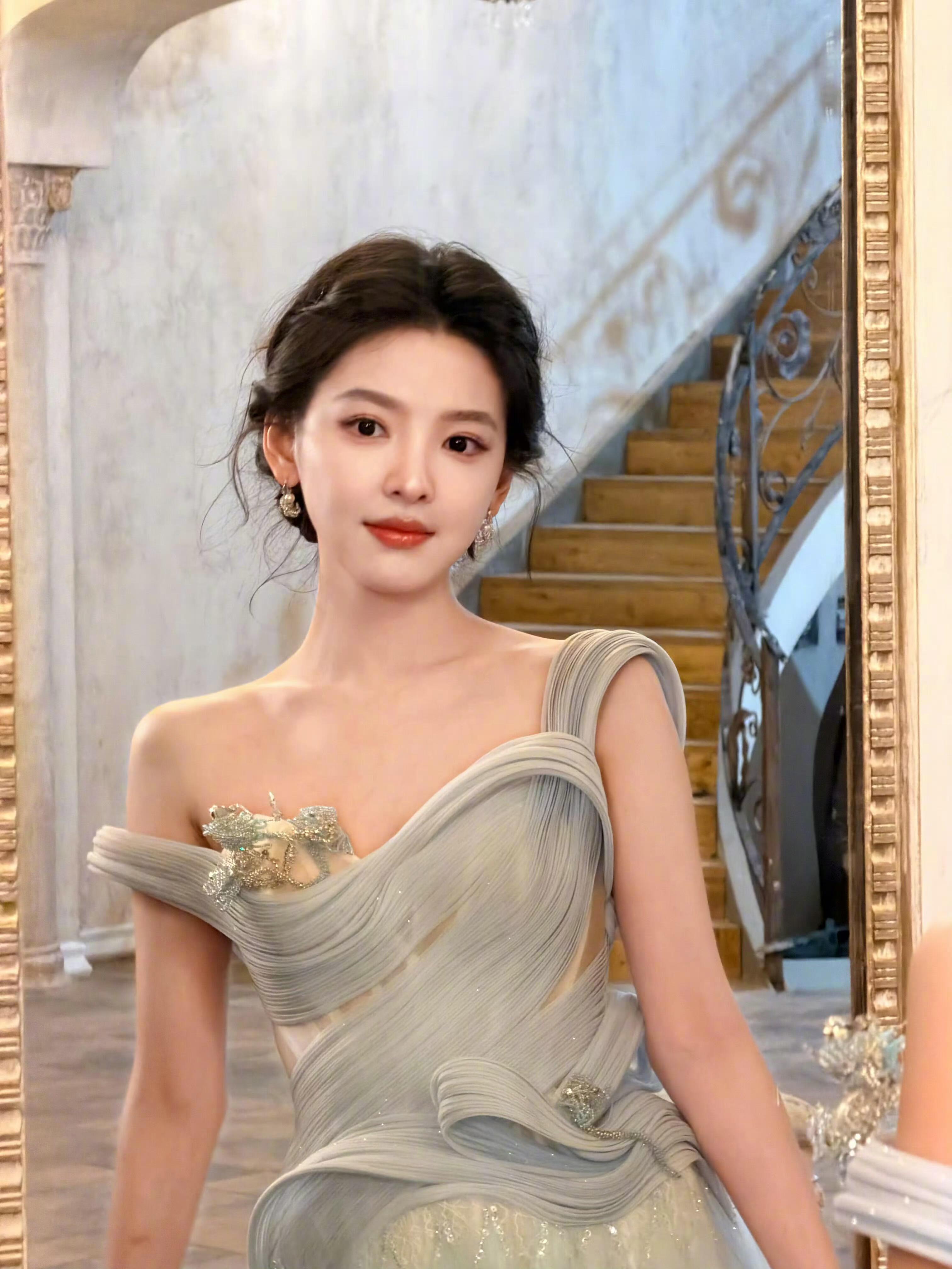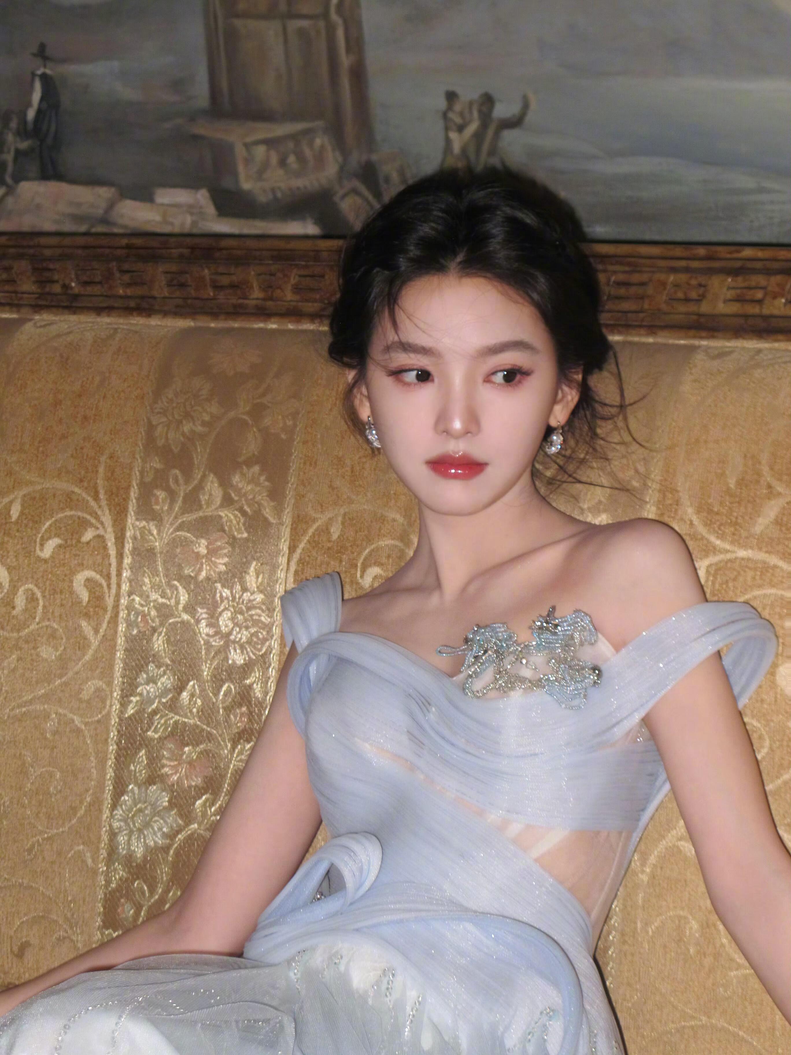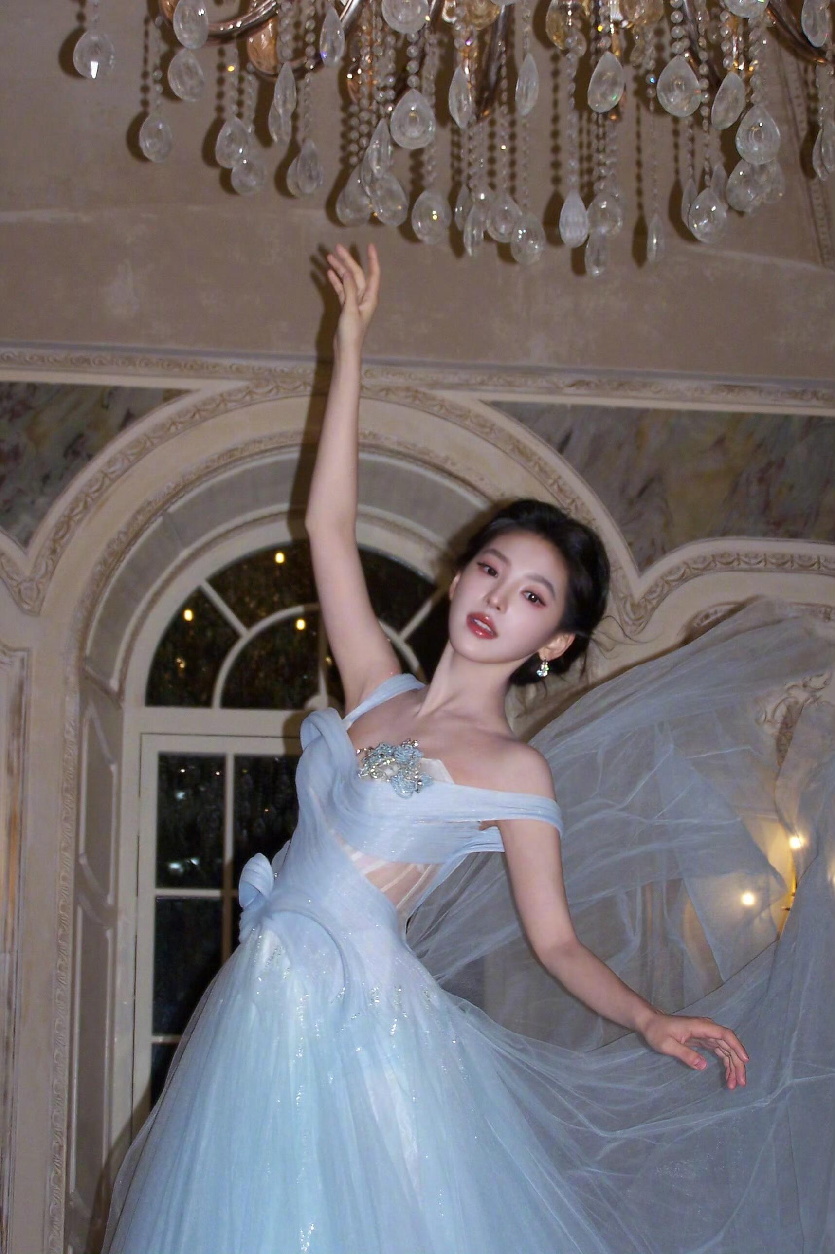 章若楠亮相直播现场,身着秋冬系列的淡蓝色薄纱礼裙,搭配超闪的珠宝,一整个梦幻又迷人,于复古氛围中演绎高定美学,尽显优雅动人的公主气质