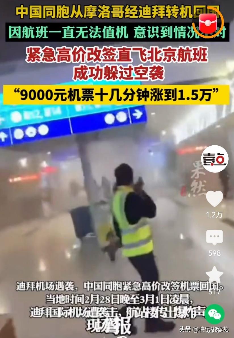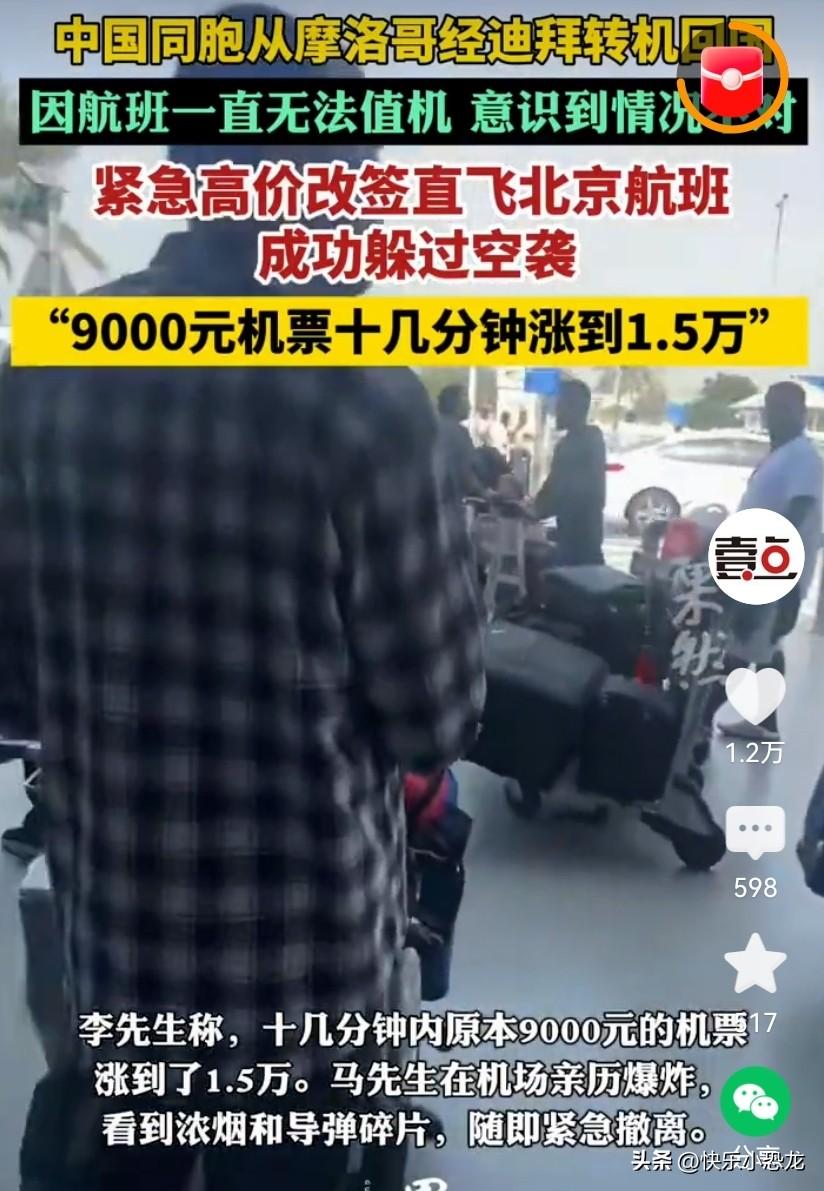 太惊险了!一名男子紧急高价改签机票回国,成功躲过当地空袭,原本9000元的机票在十几分钟内直接涨到了15000元。他说当时顾不上多想,只想着尽快离开危险区域,能平安到家比什么都重要,多花的钱在生命面前根本不值一提。 男子和妻子本来在中东度蜜月,好好的旅行,说乱就乱了。到处都是空袭警报,耳边时不时传来爆炸声,街上的人慌慌张张到处躲,待在酒店里都觉得心慌,一刻也待不下去。 他赶紧拿出手机刷回国的机票,前一秒看还是9000块,十几分钟的功夫,价格直接跳到15000,座位还在一张一张减少。 他根本没功夫心疼钱,立马付款下单,抢到了最后一张票。等他坐上飞机顺利起飞没多久,当地机场直接关闭,所有航班全都停飞,再晚一点就真的走不了了。 平常过日子,大家都会算着钱花,多花六千块谁都会心疼,可在那种随时有危险的地方,钱根本不算什么。他身边就有人舍不得加价,犹豫了几分钟,票就没了,只能困在原地提心吊胆。 经历过这一次,他比谁都明白,平安比什么都重要,能活着回家,比多花多少钱都值。 也有不少人说,这种时候机票疯狂涨价太不地道,趁着别人着急逃命抬价格,实在是趁人之危,让人心里很不是滋味。 看看我们现在安稳的生活,真的特别珍贵,不用担惊受怕,不用慌着逃命,平平安安的日子,就是最好的日子。 各位读者你们怎么看?欢迎在评论区讨论。
