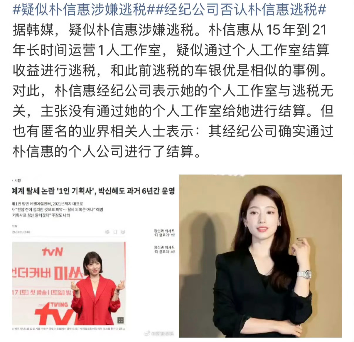 据韩媒报道朴信惠涉嫌逃税,但经纪公司目前是否认的!