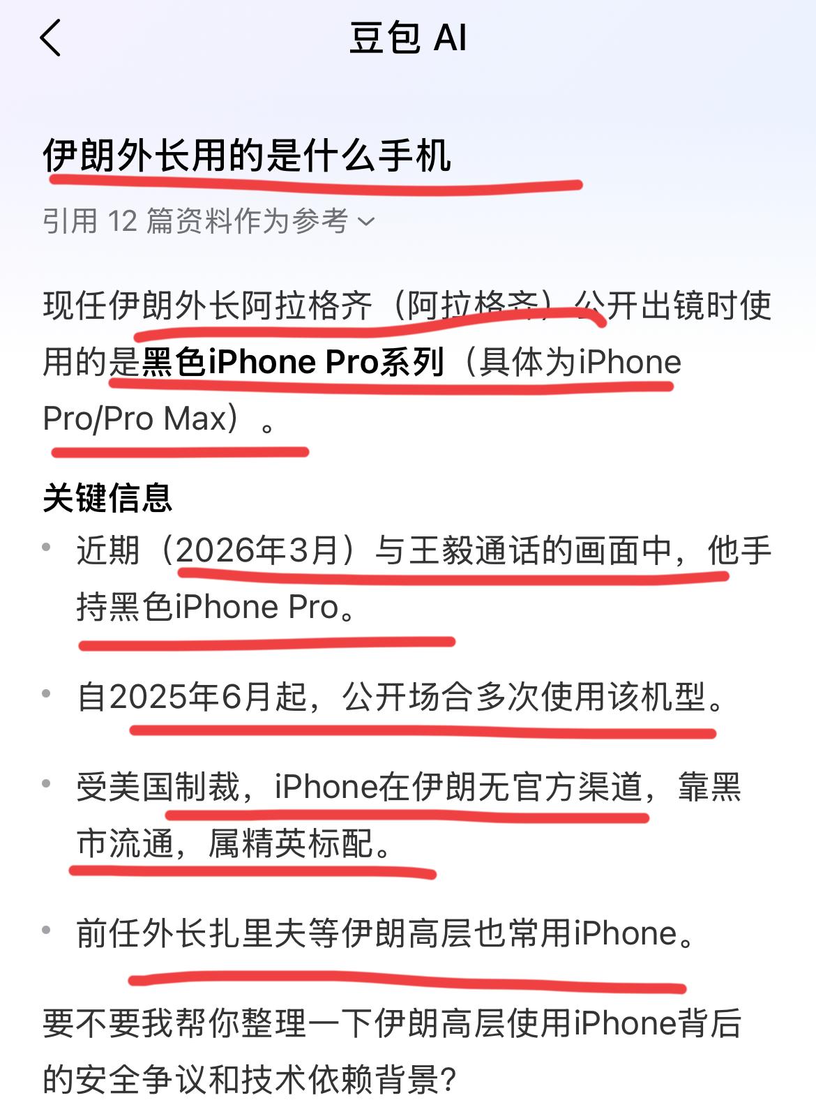 离了大谱了!! 看看吧,这叫做啥? 不作不Si啊~ 都这个时候了,伊朗外长还在用最新款的苹果手机,伊朗革命卫队高官开会还在用微软的系统,你让我怎么说好呢? 我问了一下AI,它告诉我,这是事实,伊朗外长很喜欢美国货,苹果手机在伊朗备受追捧,只有精英人士太配使用,只有花高价在黑市才能买到~ 我的天呢,真是外国月亮比他们国内圆!! 基于以上情形,发生美帝第一次军事打击,都把伊朗开会高层一个不漏,全部干掉这样的奇葩事件,一点都不要感到惊奇~ 都是这样的,一开会就会被精准打击,甚至团灭,啥原因,还不懂么? 只有严查被严重渗透的高层,伊朗可能还有点希望,你说呢?