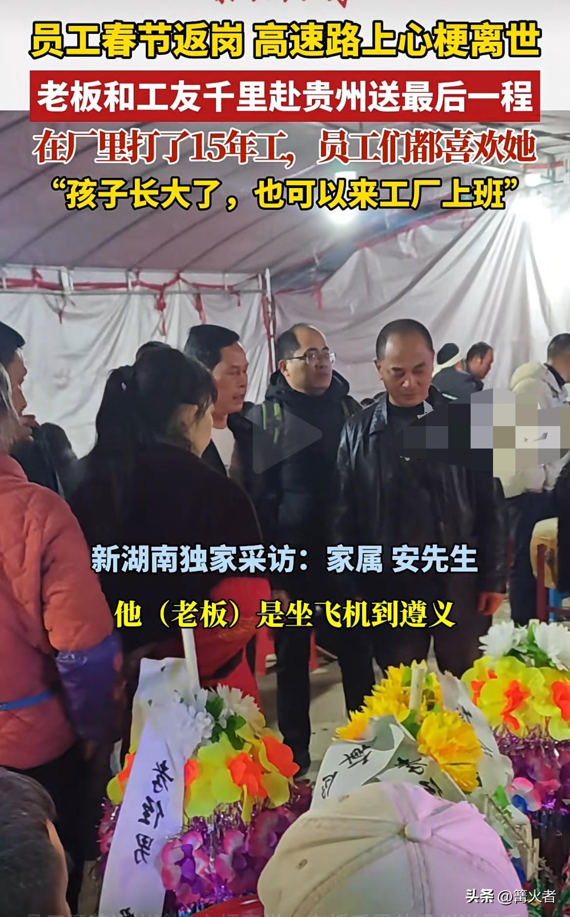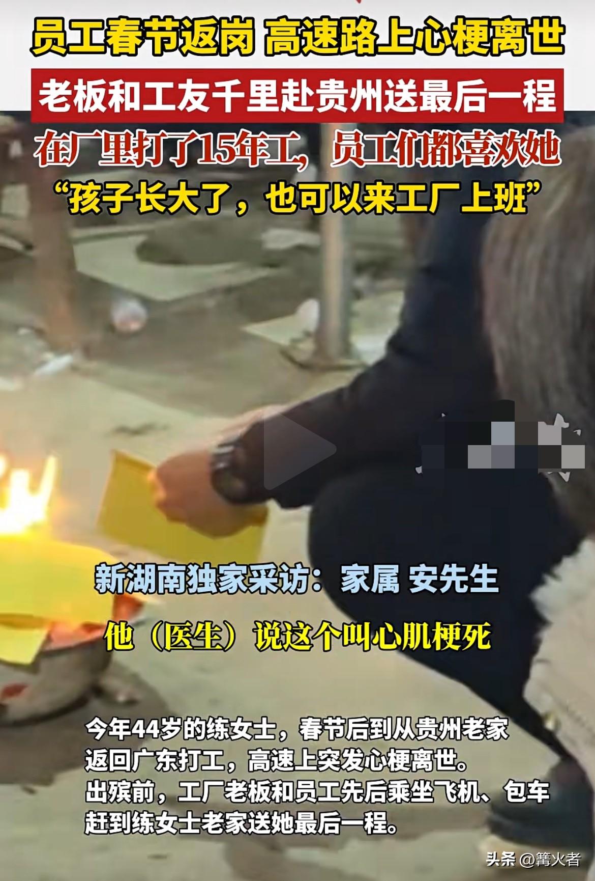 在高速上突发心梗离世。得知消息后,老板李先生带着车间主任先坐飞机到遵义,再包车前往练女士老家,他们踩着泥巴路摸进村,在灵堂前默默点香、烧纸,家属安先生说村里人都很感动,这样的老板让人体会到了职场中的温情。
