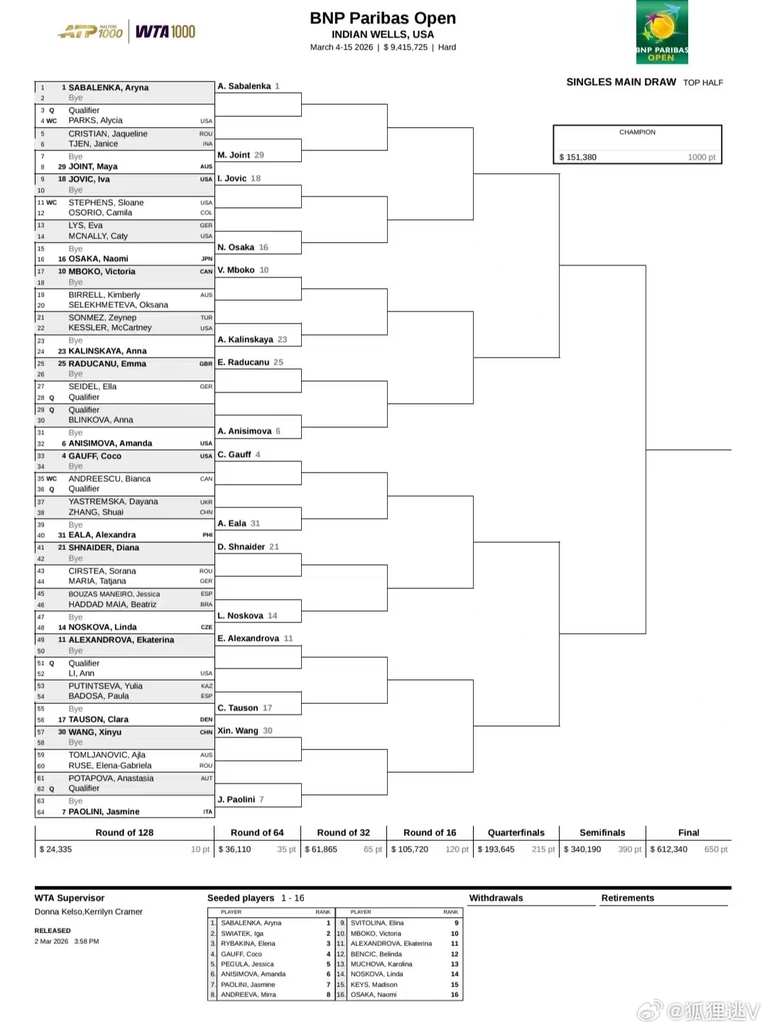 早上好!IW女单签表出来了,大家还是自己且看且分析吧。郑钦文印第安维尔斯赛签运郑