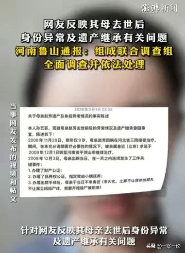 “小说都不敢这么写呀!”河南鲁山,女子9岁时,母亲离世,母亲委托小姨抚养她,母亲生前,有大量的珠宝翡翠,有商户,有多处房产,小姨说等她成年之后,再协助她办理遗产继承,可等她成年之后,去办理遗产继承,却发现母亲的遗产只剩下商铺了,并且母亲离世之后,还和她的弟弟结婚,这实在是太离谱了。 这事情太神奇了,孙女士的母亲已经离世,离世之后还能和弟弟结婚,她的珠宝翡翠,还有多处房产,也不翼而飞了,只剩下商铺留给孙女士继承,这件事让孙女士感到匪夷所思。 母亲的身份如此异常,现在她要继承母亲的遗产,又出现这么多的问题,她决定追究下去。 就在2008年,那年她才9岁,她的母亲病重,她回想起母亲病重出院这件事,就觉得非常的蹊跷。 那时她的母亲是在北京治疗,但是她的亲属却舍近求远,没有充分证明,要出于医疗必要就进行转院,她的亲属就将她的母亲转到比较远的地方,进行治疗。 如果她的母亲确实是转院之后,能够到别的地方治疗,是因为治疗不了才离世的,孙女士也不会有那么多的想法。 离奇的是,她的母亲在出院当天,发生了3件事情,这3件事情,让孙女士感到这就是一场阴谋。 在她母亲出院当天,她的母亲就去办理了财产公证,同时也办理了抚养权公证,由小姨抚养她,这些都没有什么奇怪的,毕竟她那时才9岁,母亲如果意识到自己时日不多,做好这些准备,也是可以理解的。 奇怪的是,办理了出院手续之后,当天她的母亲就离世了,这太蹊跷了,当时孙女士虽然只有9岁,但是她不相信这件事。 当时她的母亲没有火化,只是土葬,但是小姨并没有让她去参加母亲的丧礼,更没有让她看母亲最后一眼,她要求开棺验尸也被拒绝了。 但是她还小,大人不让她做的事情,她也无可奈何,她只能平复自己内心的悲伤,之后跟随小姨生活。 但是孙女士知道,母亲很有钱,她亲眼看见过母亲的那些珠宝翡翠,她也知道母亲有商铺,有多处房产,这些都应该由她来继承。 但是她还没有成年,母亲的遗产都由小姨他们帮忙管理。 这也无可厚非,小姨还跟她说,等到她成年之后,会协助她进行遗产继承的。 还没有成年的孙女士,只能听小姨的,但奇怪的是,从2008年到2018年,整整10年时间,小姨都没有让她见自己的亲生父亲。 这是孙女士感到不可理解的地方,她已经没有母爱了,为何小姨要阻止她见亲生父亲呢? 这是孙女士想不通的地方,不过孙女士长时间不见父亲,对父亲也没有了思念。 很快她成年了,当她要继承母亲的遗产,更加离奇的事情发生了。 她成年之后就去公证处,去继承母亲的遗产,这时她才知道,她母亲的遗产只剩下商铺了,那些珠宝翡翠,那些房产都已经不翼而飞了。 更加奇怪的是,母亲明明已经离世,她却可以和自己的弟弟结婚,这到底是怎么回事?孙女士赶紧去调查。 事情要回到2008年的12月3日,从这天开始,孙女士母亲的事情非常离奇。 孙女士的母亲在2008年12月3日离世的,可是她的母亲离世不到10天,在12月12日这天,就有人以她母亲的名义,让她小姨卖掉那些房产。 很快,才过了几天,这些房产的房款都转给了她的小姨,对于后来这些房款到底到了哪里,她并不知道。 她只知道到了2009年的12月19日,明明已经离世的母亲,居然能够和舅舅结婚,这太离谱了,离世的人怎么可以和自己的弟弟结婚呢? 虽然在2013年,母亲和舅舅都申请了死亡注销户口,她母亲的信息,这才消失在这个世上。 这些事情都太离谱了,母亲的身份如此异常,母亲的遗产又不翼而飞,孙女士感到非常的无助。 只能将自己所遇到的事情发了出来,很快通报出来了,工作人员表示将会成立联合调查组,全面调查并依法处理,相信这件事,孙女士很快会得到自己想要的答案。 孙女士遇到的这些事情,确实是很离谱,母亲死后与自己弟弟办理结婚手续,这太神奇了,母亲的遗产,应该是被亲属给霸占了。 如果真是亲属霸占了孙女士母亲的遗产,这就是盗人家的钱财,太无耻了。 发生这样的事情,亲属如果真的是霸占了孙女士母亲的遗产,这是不当得利,是需要返还的。 《民法典》第122条规定:因他人没有法律根据,取得不当利益,受损失的人有权请求其返还不当利益。 毕竟这么多的财产,他们利用孙女士年幼,不知道母亲的遗产,想不知不觉去霸占,这是非常可耻的。 那么你对孙女士遇到的事情有何看法呢?