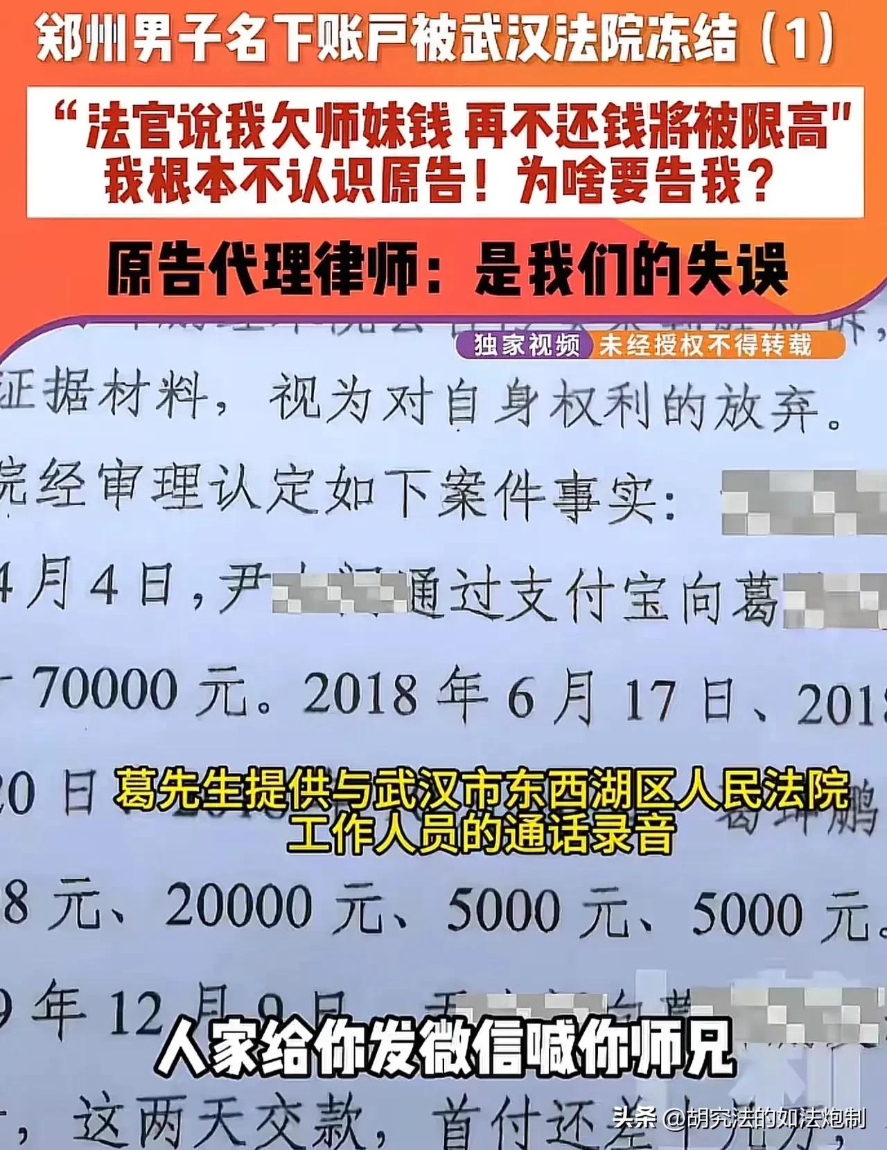 人在家中坐,锅从天上来!河南郑州,一男子发现银行卡被法院冻结,连忙向法院询问情况。可工作人员却说,你欠了师妹的钱,要是还不还钱就限号。男子听完懵了,我既没有师妹,也没借过钱!见工作人员不信,男子找来律师,发现自己跟被告同名同姓,这才闹了乌龙。可还没等男子松口气,离谱的事情接着发生了。 这天,葛先生突然发现自己无法线上支付了,起初他还以为是系统的问题,可询问了身边的朋友发现其他朋友的线上支付均正常,唯独自己的无法支付。 葛先生连忙询问了一位懂行的朋友,朋友建议让他查一查自己名下的银行卡是否有什么异常。 这一查不要紧,葛先生竟发现自己名下所有的银行卡包括各种支付软件全部被法院冻结了。 资产被法院冻结,就意味着葛先生存在什么经济纠纷,可是葛先生想来想去也实在想不出来,自己到底在哪方面出了问题。 老话说一分钱难倒英雄汉,几乎是身无分文的葛先生简直寸步难行。 既然是法院冻结了他的资产,葛先生决定去法院问个明白。 可工作人员的话,让葛先生更加迷茫了。 工作人员称:你欠了你师妹的钱不还,被师妹给告了,法院肯定要冻结你的资产,如果还不还钱的话,就限制你高消费。 葛先生听得云里雾里,自己从来没拜过哪个山头,从哪里又来的师妹呢? 可任凭葛先生说的口干舌燥,法院的工作人员根本就不听,还认为葛先生是强词夺理。 走投无路之下,葛先生只能寻求律师的帮助。 专业的人干专业的事情,在了解完前因后果之后,律师随即展开了调查,这才发现还真是闹了个乌龙。 原来,葛先生与真实的被告同名同姓,而且住的地址相距不远,更离谱的是,葛先生与真实的被告模样还有五六分相似。 对方的律师在粗略查看基本信息之后,便错误的将葛先生当成了被告。 真相终于水落石出,葛先生也重获清白。而法院那边也承认是工作失误,第一时间帮助葛先生解冻了账户。 误会终于解除了,葛先生不由得松了一口气。可这件事过去了半个多月,葛先生无意中发现,那条错误的执行案件信息还挂在法院的网络上,里面被执行人的名字以及身份证号码,家庭住址等还是葛先生的。 也就是说,葛先生还是被列为了老赖。 人活一辈子不就图个好名声吗?葛先生是个好面子的人,如果被他周围的朋友知道自己是个老赖,那可就解释不清了。 葛先生非常的生气,不过他也明白自己人微言轻,于是便找来记者协调。 可是面对葛先生的质问,工作人员却有些不耐烦了。对方表示,已经让葛先生提交材料进行审核了。 葛先生继续追问,为什么当时没有把资料核实清楚,面对这个问题,对方一直未能给出解释。 【网友热议】 “这种事情本来就不应该发生,仅凭名字就冻结账户,证明法院在执行上违反了相关程序。” “明明是过错方却如此理直气壮,明明是受害方却如此小心翼翼,这简直就像是一个笑话。” “建议严查!上次出现这个错误的法院院长被罚,法官也被撤职了!” 【案例解析】 这一起看起来让人哭笑不得的乌龙,其背后暴露的问题可真不小。法院工作人员在执行程序上未能认真审核,仅仅凭借名字便冻结了葛先生的账户,且葛先生被执行的信息长时间挂在法院网站上。 如果由于法院的失误,对葛先生造成名誉上的侵害。根据《民法典》第一千零二十四条规定,民事主体享有名誉权。任何组织或者个人不得以侮辱、诽谤等方式侵害他人的名誉权。 名誉是对民事主体的品德、声望、才能、信用等的社会评价 而法院网站上那条显眼的被执行人信息,就像是一根钉子,把葛先生的声誉全部都都钉在了耻辱柱上。 法院作为审判机关,简单来说,判谁有罪判多少年都是法院说的算,直接关乎一个人的前途和命运。 可如此不负责任的事情却真真实实的发生了,难道就能不明不白的过去? 对此你怎么认为?