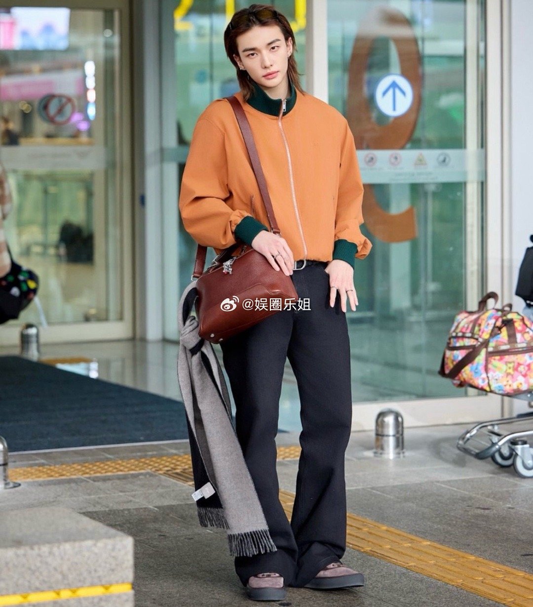 此外,Stray Kids 铉辰同样以吸睛造型出发,橙绿撞色外套+微喇黑裤,复古与活力并存。