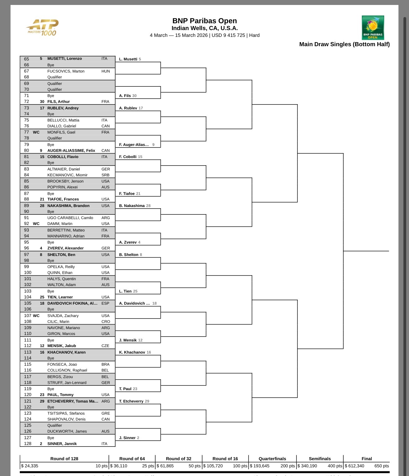 网坛风云 印第安韦尔斯大师赛公布正赛签表,阿尔卡拉斯、辛纳位列头两号种子镇守上下