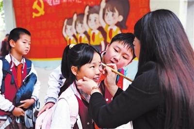 高新区景阳小学迎新仪式上,老师为学生点朱砂。