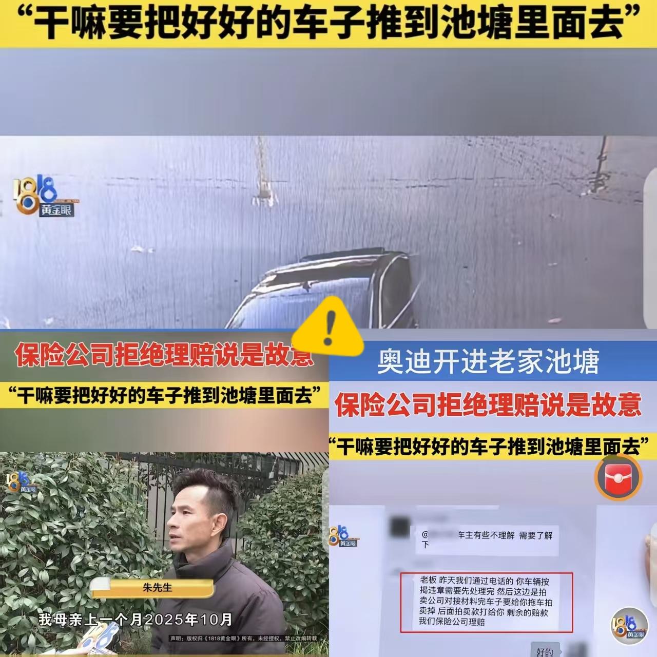 “玩不起!” 浙江杭州, 一男子开着自己花43万买的奥迪A6L回家出了问题,买保险时笑脸相迎,理赔时直接翻脸,这不是服务,是套路。 杭州朱先生回老家看望受伤母亲,捡手机时误踩油门,奥迪冲进池塘,万幸车窗没关才捡回一条命。 他按要求结清车贷、提交材料,等着36万理赔。 结果保险公司一句“故意骗保”就拒赔,理由更是荒唐:保额高于二手车市场价。 这逻辑根本站不住脚,保额是投保时保险公司定的,车主没法预判车价涨跌。 朱先生刚花五千多换轮胎,爱惜车子,谁会拿命去赌一场意外? 保险公司只讲怀疑不讲证据,用推测代替契约,摆明了欺负普通人耗不起官司。 契约精神不是单方面的,收保费痛快,赔保费就耍无赖,实在让人寒心。 大家觉得保险公司该不该赔?换你遇到这种事会怎么办?奥迪a6l政策 奥迪a 6 audi a6 奥迪价 上汽奥迪a6 奥迪车险 南昌奥迪a6l
