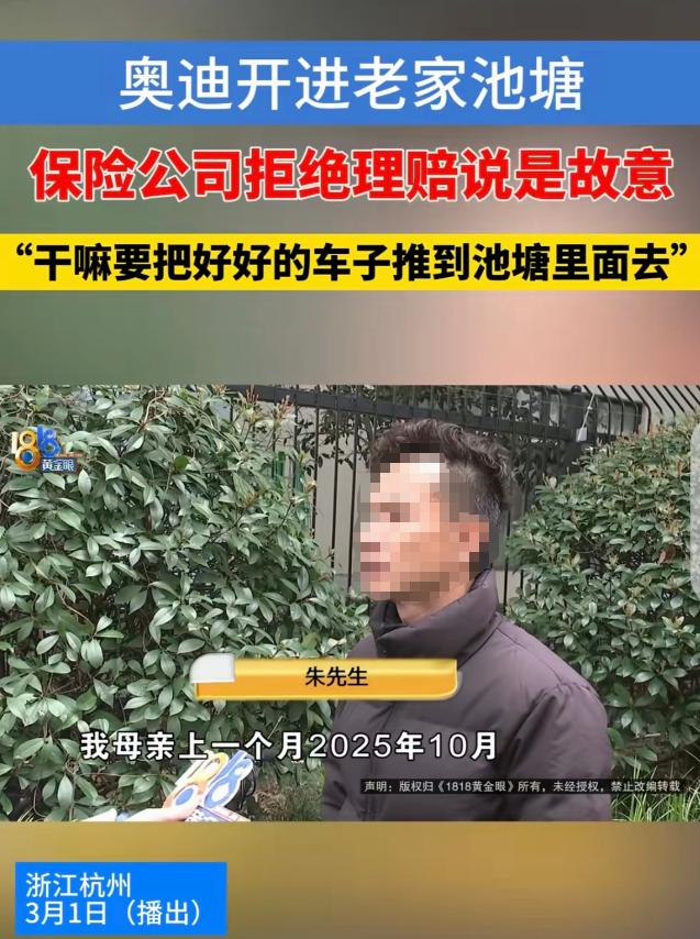 “玩不起!”浙江杭州,一男子开着自己花43万买的奥迪A6L,回老家看母亲,直接把车开进池塘,他从开着的车窗爬了出来,车子却泡水报废了,按全车险保险合同,他能获赔36万,但保险公司却拒绝理赔,一口咬定,他是故意把车开进池塘的,理由是同期同款车型售价是25-30万,车损险保额远高于市场价值,不服就去告。男子彻底傻眼了。 事情发生在2025年11月18号,他母亲前一个月胳膊摔断了,他特意开车回老家看望,没想到路上出了意外。 那天他开在老家的一段小路上,那是条连续转弯的混凝土路,路面很窄,宽才2.7米,路况本来就一般。开着开着,手机滑到了副驾驶座上,他下意识弯腰去捡,脚下没注意,一脚踩到了油门上,车子瞬间冲了出去,直接扎进了路边的池塘里。 万幸的是,之前他给路边老乡递过烟,主驾车窗一直开着,车子进水熄火后,他赶紧从车窗爬了出来,除了喝了几口池水,人没受一点伤。他第一时间联系了保险公司,工作人员过来勘察现场,忙活到晚上八九点钟,才把泡水的车子打捞上来。 朱先生买的是人保的全车险,其中机动车损失险的保额是36.65万,车子泡成那样,明显已经报废了,他想着按保险合同,总能拿到这笔理赔款。 没过半个月,保险公司的人给她打电话,问他车子有没有贷款,他说还有几个月没还完,对方让他赶紧把贷款还清,把车辆登记证书(绿本)寄过去,说等车子拍卖后,剩下的钱由保险公司理赔。 朱先生没多想,赶紧按要求还清了车贷,把绿本寄到了老家的保险公司。2025年12月26号,保险公司工作人员还跟他说,调查公司那边的报告快出来了,没什么大问题,等车辆承保地浙江这边确认后,就安排打款。 可谁能想到,等到今年1月6号,朱先生收到的不是理赔款,而是一份拒赔通知书。 上面明明白白写着,车子不属于保险责任赔偿范围,理由是投保人故意制造保险事故。朱先生当场就懵了,他反复问保险公司,自己到底哪里故意了,对方却只拿一份第三方鉴定报告说事。 这份鉴定报告里说,朱先生的车落水时很反常,是大角度右转偏移,避开路边的木棍后,以接近垂直岸边的姿态落水,落水角度36.6度,前轮转角27.8度,方向盘转了超过250度,这些都和朱先生说的“捡手机踩错油门”对不上。 更离谱的是,保险公司还说,同期同款的奥迪A6L,市场价才25到30万,而朱先生的车损险保额有36.65万,远高于市场价,所以认定他是故意毁车骗保。 这话听着就气人,朱先生当初买车花了43万多,是当时的正常售价,车损险的保额也是投保时保险公司和他一起定的,当时怎么不说保额高,不拒绝承保?现在车子出了事,就拿市场价说事,反过来诬陷车主故意骗保,这不是玩不起是什么? 最近奥迪A6L确实在降价,不管是保定还是其他城市,2025款和2026款的车型优惠幅度很大,入门版裸车价才27万左右,主销款也才30万上下,但这是现在的市场价,不能拿现在的价格去衡量几年前买的车,更不能以此为理由,否定当初的保险合同。 朱先生怎么也想不通,自己好好的车,刚换了新轮胎,平时做生意还得靠它代步,怎么可能故意开到池塘里? 他找保险公司要说法,对方态度强硬,只说鉴定结果就是这样,不服就去法院起诉。可打官司又费时间又费钱,朱先生一个做小生意的,根本耗不起。 说白了,保险公司就是不想赔钱,找了一堆所谓的“理由”搪塞车主。 投保的时候,笑脸相迎,把保险说得天花乱坠,承诺只要符合条件就一定理赔;可真到了要掏钱的时候,就开始找各种借口推脱,甚至倒打一耙,把车主逼到绝境。 朱先生的遭遇,其实很多车主都可能遇到。保险公司手握鉴定报告,占据主动权,普通车主维权难、维权成本高,很多人最后只能认栽。 但这事里,保险公司的做法确实站不住脚,保额是双方认可的,鉴定报告的“反常”也不能直接认定是故意,毕竟开车时的突发情况,本来就有很多不可控因素。 现在朱先生车没了,车贷还完了,理赔款也拿不到,相当于43万买的车,最后只换来了一身麻烦。 希望这件事能引起关注,也提醒各位车主,投保时一定要看清楚合同条款,遇到保险公司不合理拒赔,也别轻易认栽,该维权还是要维权,不能让保险公司白白欺负人。