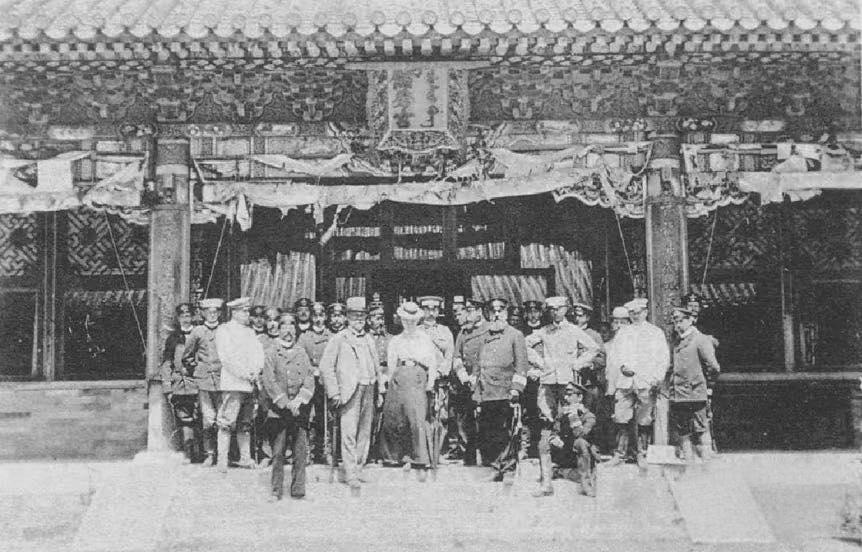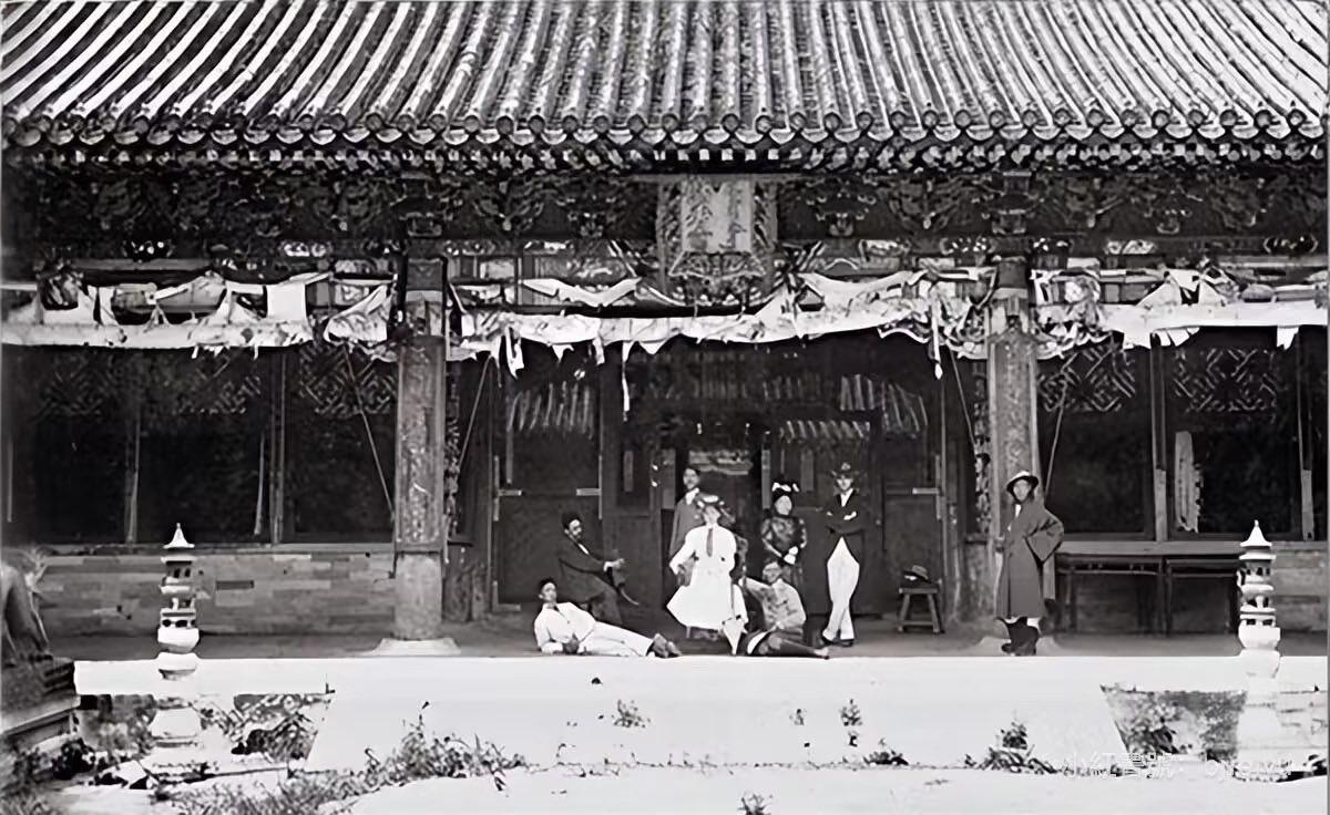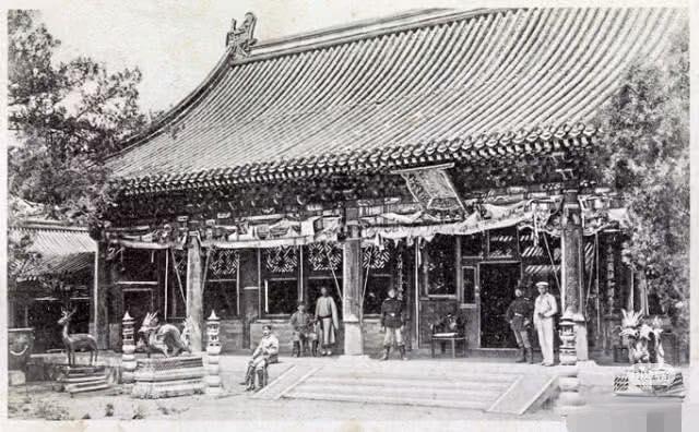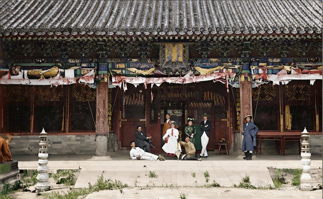 这组照片是1900年八国联军占领北京后,在故宫储秀宫前拍摄的,作为慈禧太后的寝宫,储秀宫成了联军炫耀“胜利”的场所。 照片中的储秀宫,檐下的彩画和装饰已经破损不堪,庭院里杂草丛生,与我们今天看到的修缮一新的故宫形成了巨大反差,这正是慈禧出逃后,皇宫无人打理的真实写照。