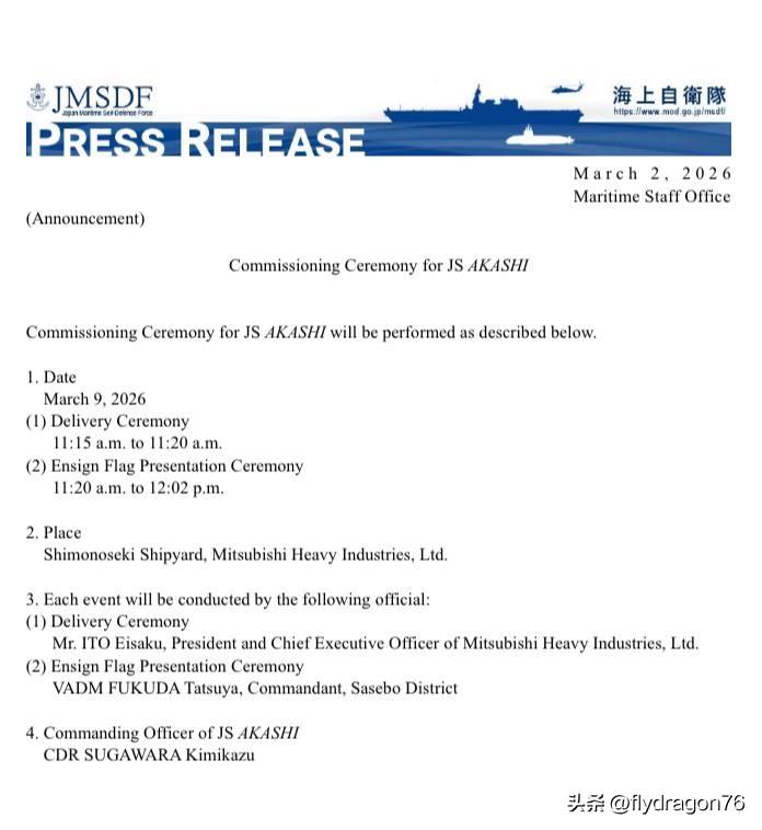 🇯🇵日本造船厂三菱重工将于2026年3月9日在下关造船厂向日本海军交付水文测量船“明石”号(AGS-5107)。 该船将隶属于日本海洋司令部,取代即将退役的老旧“若狭”号(AGS-5104)。其母港为横须贺海军基地。