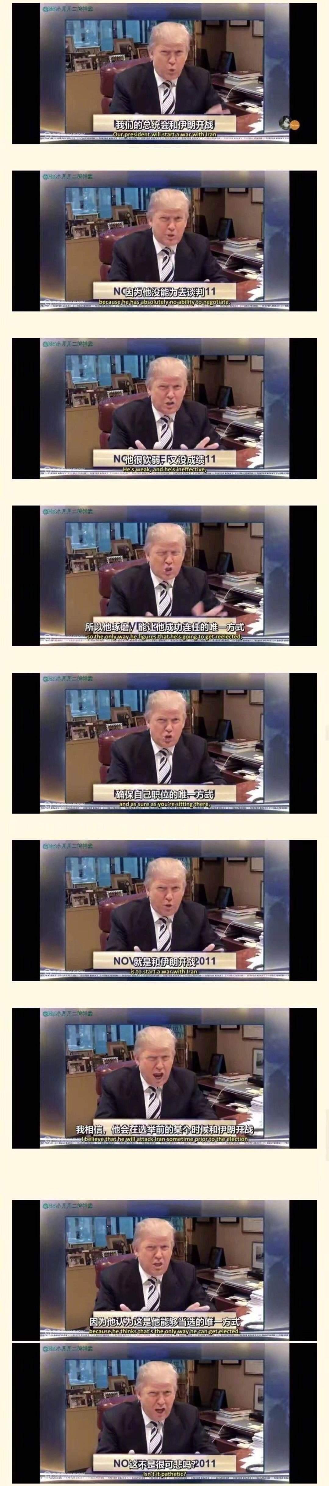特朗普十几年前扔出去的回旋镖,在今天扎自己膝盖上了。 2011年奥巴马执政时期,美国和伊朗的关系也因为核问题一度非常紧张。 当时,一个打算从政的美国富豪吐槽奥巴马:“我们的总统一定会对伊朗开战,因为他又蠢又没用,根本不会谈判。为了连任,他只能靠打仗撑场面,这太愚蠢,太可悲了。” 这个富豪就是现在的美国总统特朗普。 当年他吐槽奥巴马的话,每一句都可以非常精准的用到今天的他身上。 伊朗的问题明明谈判也能解决,而且伊朗已经妥协。 可他就为立个强人人设,不计后果的开打。 所有人都知道他打伊朗就是为了中期选举,有那么点屠龙沙漠终成恶龙的意思。 可惜,他不是龙,他就是个爱在污水里打滚的无赖。 他现在所做的每一件事都和他选举的口号反着来。 今天的特朗普已经不是昨天的特朗普了; 明天的特朗普会是什么样子? 没人知道! 他自己也不知道。 他现在行事风格就是——脚踩西瓜皮,滑到哪里就是哪里。