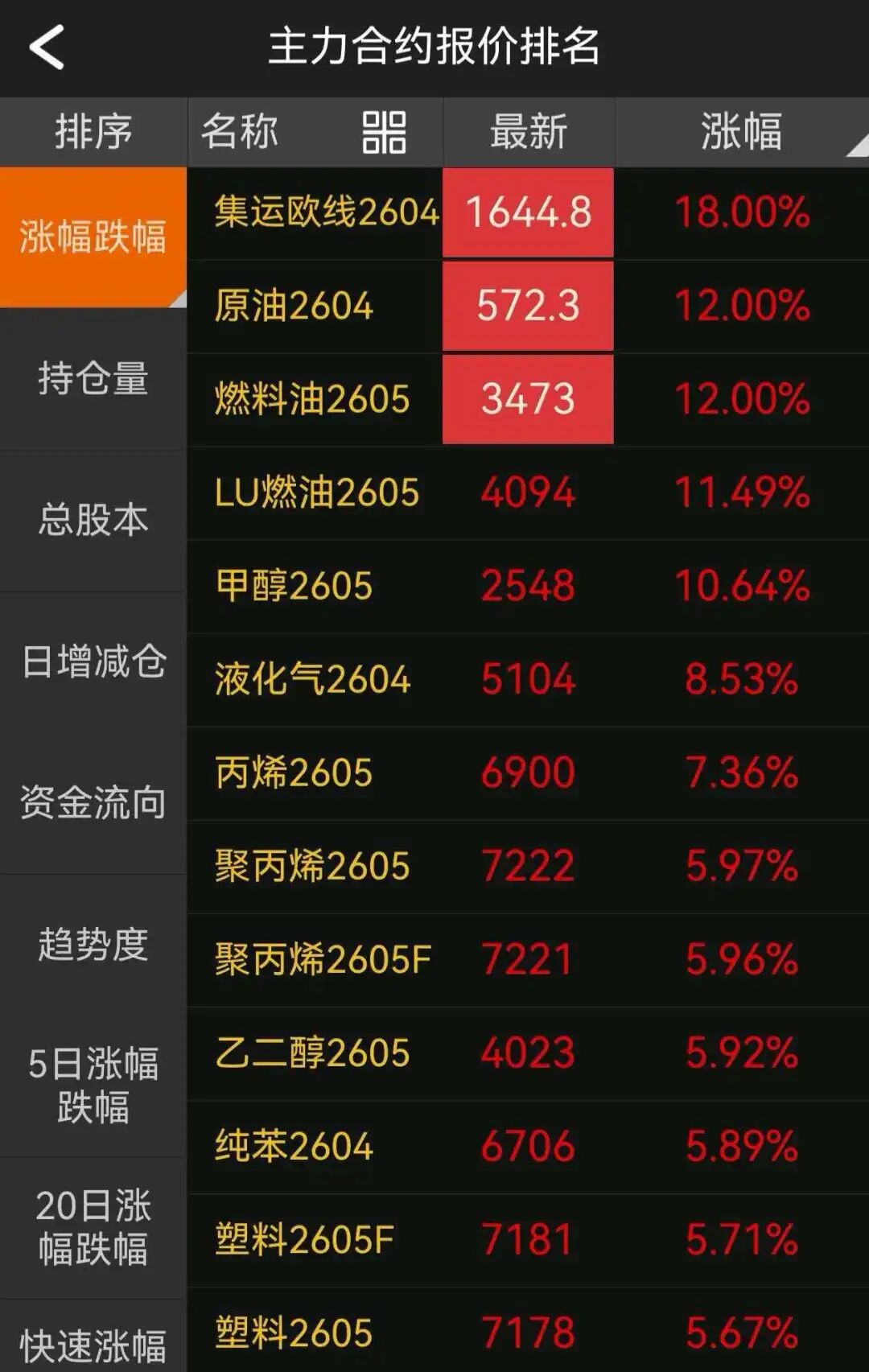 文华财经数据显示,截至上午收盘,集运指数(欧线)期货主力合约涨停,涨18%;原油、燃料油期货主力合约涨停,涨12%;低硫燃料油期货主力合约涨超11%,甲醇期货主力合约涨超10%,液化气期货主力合约涨超8%,丙烯期货主力合约涨超7%。