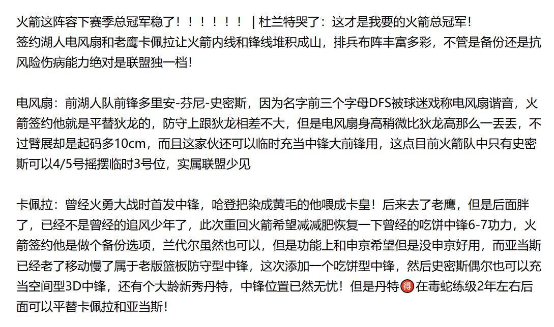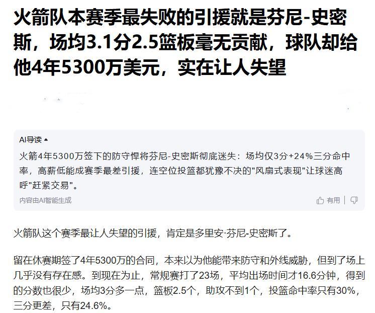 芬妮史密斯,从过去的优质3D锋线沦为了铁匠。过去,湖人球迷将史密斯称之为电风扇,和范德彪组成了湖人的防守双雄。上个赛季,湖人战绩上升和史密斯的加盟有很大的关系。史密斯加盟火箭时,很多人都说湖人将一溃千里,而火箭将组建锋线群,傲视联盟。 然而,大半个赛季过去后,史密斯的水平真是一落千丈。这个赛季,史密斯场均3+2.5,数据几乎可以忽略不计,命中率只有30%,三分命中率只有24%。为什么他的状态下滑这么快?一个是伤病,还有一个重要的原因,就是火箭没有出色的组织者,传球者,单打比较多。 另外,上个赛季,他就已经有了下滑的特征。上赛季在湖人,很多空位三分都不敢投,犹犹豫豫,浪费的大量的出手机会。上赛季好的是防守还在,但是三分已经明显下滑。但是由于湖人体系的原因,他的下滑被掩盖了,所以火箭就上了一个当。