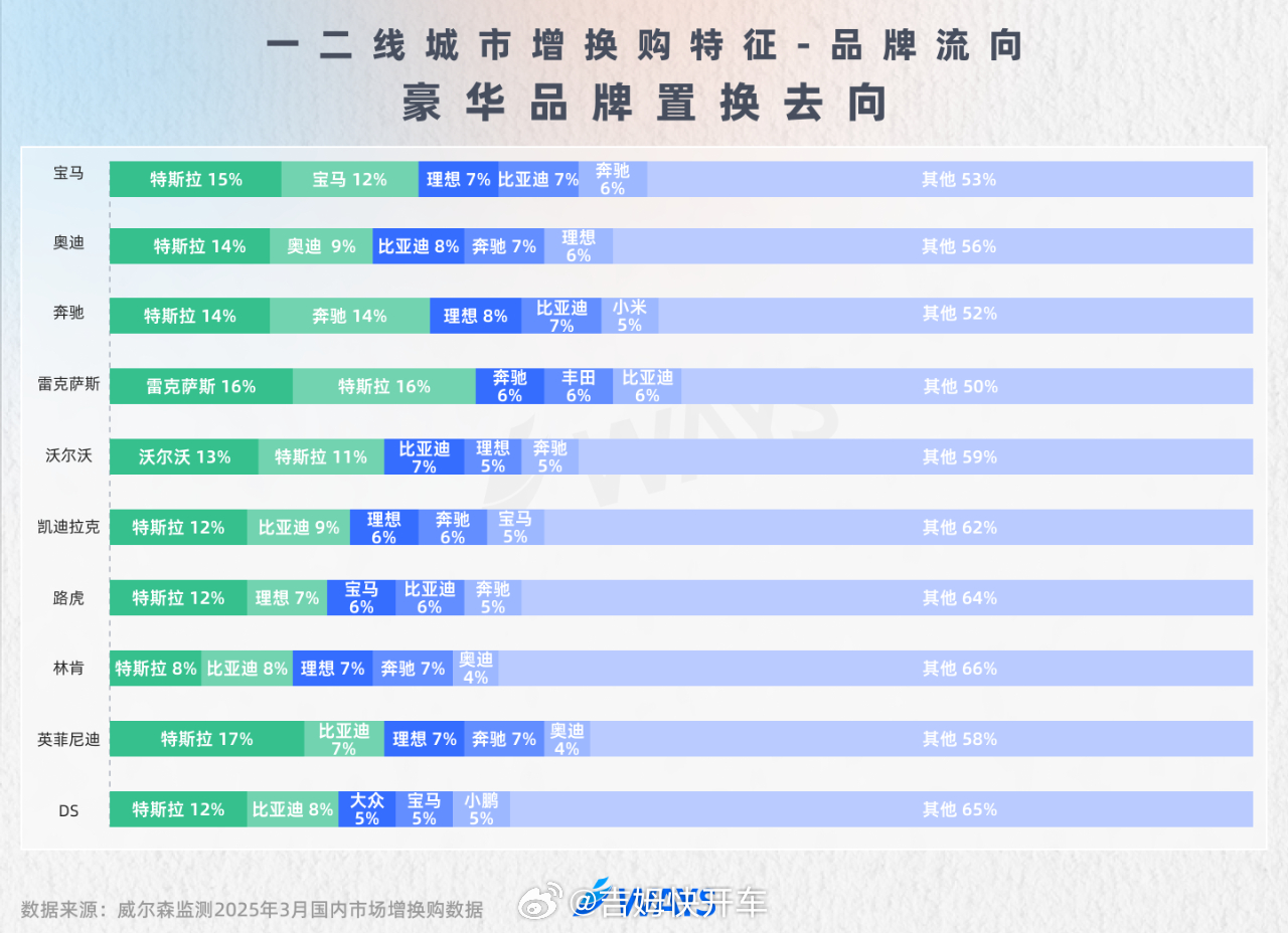 豪华车车主置换的第一选择都是特斯拉,合资车主和自主车主大多数置换的是比亚迪。