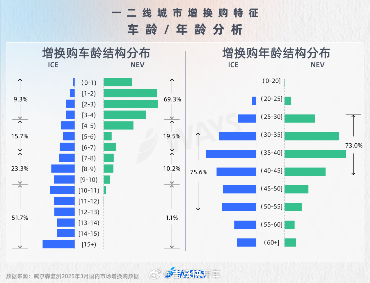 一组非常有意思的数据,油车车主置换普遍超过10年,新能源车主置换普遍4年内。