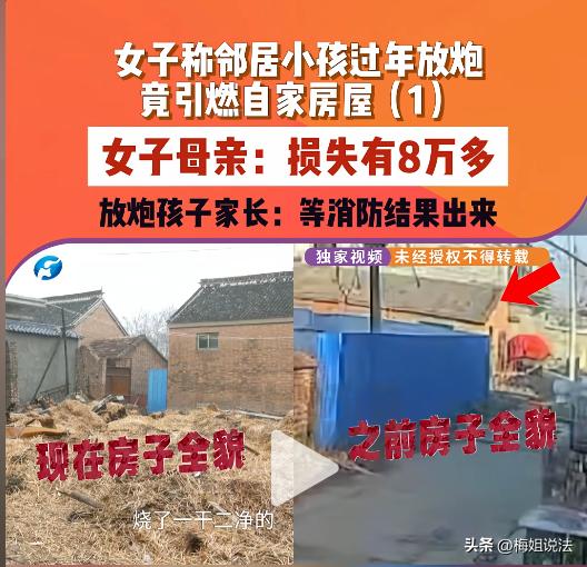 河南周口,太康县。大过年的,李女士家的三间瓦房突然起火,半小时不到,房梁、拖拉机、轮胎全烧没了,清点下来损失8万多。通过监控发现,起火原因竟是隔壁家小孩放鞭炮,引起的火灾。李女士气愤地去找孩子家长要个说法,但没想到家长态度强硬,硬是说不是自家孩子放的火。双方越吵越激烈,村委介入也没能解决这个问题。那么这场火灾事故到底是谁的责任呢? 大年初一下午3点半,李女士一家人正在屋内忙活,屋外突然传来几声“砰、砰、砰”的炮响,农村过年放炮常见,一家人没太在意,可谁也没想到,这几声炮响会酿成大祸。 不到三分钟,院外就传来邻居急促的呼喊:“着火了!你家房子着火了!” 李女士一家人疯了似的冲出去,眼前的一幕让他们瞬间懵了。 瓦房的后墙角落,火苗已经窜起半人高,房梁的木头疯狂往上翻,院子里的拖拉机、堆放的轮胎、干草也烧着了,黑烟滚滚直往上冒,遮了半边天,呛得人睁不开眼、喘不上气。 消防人员赶到后,看着烧得摇摇欲坠的瓦房,车子根本进不去灭火,只能调来挖机,推倒临近的墙体,把消防车开进院里,接上水枪,阻断火势蔓延,折腾了一个多小时,才勉强把大火彻底扑灭。 火灭了,可李女士家的麻烦来了。 三间老瓦房成了一片废墟,墙体熏得漆黑,房梁烧得焦脆,一摸就掉渣,已经成了危房;院子里的代步拖拉机,外壳被烧得变形,发动机也彻底报废,没法再用。 冷静下来后,李女士一家人突然想起来墙上装的监控,看到监控视频里有两个邻居家的孩子在自家房屋后墙根放炮。 再结合炮响与起火的时间,估计起火源就是鞭炮引起的。李女士很快就找到了放炮孩子的家长,想跟孩子问个清楚,讨个说法。 一见面,李女士的情绪就没控制住,红着眼,指着身后的废墟,对着孩子家长说:你家孩子今天下午在我家后墙根放炮,放完炮没三分钟,我家房子就着火了,你自己看看,这一片都烧光了,8万多的损失,你总得给我们一个说法吧? 孩子家长看了一眼废墟,脸上没有丝毫愧疚,反而皱着眉,语气强硬地反驳:你别张口就赖我家孩子!我家孩子是在附近放了炮,但那是在路边放的,离你家后墙还有好几米远,根本没往你家墙上扔炮,怎么可能是我们孩子引的火? 说着,她还往前迈了一步,手指着路边的方向,语气里满是气愤:我都在不远处看着,孩子放的都是小鞭炮,威力不大,怎么可能引燃你的房子?说不定是你家房子干草太多,天干物燥,自己着的火,别什么事都往我们孩子身上推! 李女士的丈夫一听这话,瞬间就火了,上前一步,拿着手里的手机监控视频,声音也提高了八度:你胡说八道什么!我家后院就放了一些干草和拖拉机、轮胎,要不是有火苗,怎么可能无缘无故着火。而且监控上拍得清清楚楚,你家孩子就蹲在我家后墙根放炮,放了不到三分钟就有黑烟冒出来着火了,不是你家孩子,还能是谁? “有监控拍到又怎么样?怎么能确定就是我家孩子的炮引的火?”孩子的家长也来了脾气,嗓门也大了起来,“当时现场还有其他几个孩子一起放炮,两个男的,那里也有监控,你们可以去查!” “你说有其他孩子在现场的视频?你倒是拿出来啊!”李女士急得跺脚。 孩子家长被问得哑口无言,顿了顿,又强装镇定地说:“现在说什么都没用,谁放的炮、是不是放炮引的火,得等消防部门的事故认定结果出来,结果没出来之前,我不会跟你们谈任何赔偿,也不会承担任何责任。” 说完孩子的家长就回屋去了,没有再回应任何问题。 看孩子家长态度这么不友好,无奈之下,李女士一家人找到了村委,并且报警处理。 警察进了放炮小孩家里问话,小孩好像是被吓到了,一句话都说不出来,村委也在旁边劝家长,还是没用。 这场起火纷争,看似是“等消防结果”的分歧,其实无非就两个关键问题: 第一个问题是到底是不是孩子的放炮行为引燃了房屋?虽然有监控视频显示是孩子放炮后着火的,但是由于孩子实际放炮的位置是监控死角,没有完整地拍到放炮的全过程和着火的全过程,只拍到了孩子路过墙角和浓烟开始冒起,确实无法直接作为实证指控火灾就是孩子引起的。 第二问题就是现场到底有没有其他放炮的孩子?孩子家长一口咬定有其他两个现场一起放炮的还有其他孩子。 根据《民法典》第1188条对此有清晰规定,无民事行为能力人、限制民事行为能力人造成他人损害的,由监护人承担侵权责任。监护人尽到监护职责的,可以减轻其侵权责任。 孩子不管是有意还是无意,闯了祸给别人造成了损失,都得由父母等监护人来承担赔偿责任。对于过年放鞭炮也是禁止的,家长没有尽到兼管义务,也是要担责的。 你对此事怎么看?你认为孩子的家长应该承担此次事件的主要责任吗?
