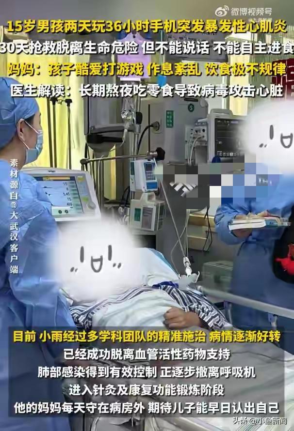 初三男生狂玩 36 小时手机后猝死边缘!抢救 30 天虽活下来,却再也无法叫一声“妈”! “如果时光能倒流,我宁愿他是个平凡的孩子,只要健康就好。” 在武汉市第三医院的重症监护室外,一位母亲早已哭干了眼泪。她死死盯着那扇冰冷的铁门,脑海里不断回放着儿子倒下前的画面:那个曾经生龙活虎、眼神灵动的初三少年,如今虽然保住了性命,却躺在病床上,无法说话、无法自主进食、四肢瘫痪,大脑因严重缺氧留下了不可逆的损伤。 这一切的罪魁祸首,竟是那个让无数孩子沉迷、让无数家长头疼的——手机。 时间回溯到 1 月 26 日清晨 7 时 30 分,寒风凛冽。初三男生小雨(化名)像往常一样走在上学的路上。突然,毫无征兆地,他直挺挺地栽倒在地。路人的惊呼声中,120 急救车呼啸而至。然而,当医生赶到时,眼前的一幕让人心碎:小雨呼吸心跳全无,瞳孔已经散大,生命体征归零。 谁能想到,就在倒地前的那个周末,短短 48 小时内,小雨累计玩手机的时间竟然超过了36 个小时! 据小雨妈妈回忆,孩子平时就酷爱打游戏,尤其是凌晨时段。那个周末,他仿佛着了魔,游戏打得直打哈欠也不肯停歇。“我喊他睡觉,他不睡,整个人都‘上头’了。”妈妈无奈地说道。除了不睡觉,小雨还不喝水、不上厕所,情绪极度不稳定,时不时对着手机屏幕大吼大叫。饮食更是混乱不堪,全靠零食充饥,营养摄入严重失衡。 正是这种极端的作息紊乱和过度透支,为这场悲剧埋下了致命的伏笔。 经过市三医院多学科团队整整 30 天的全力抢救,小雨奇迹般地脱离了生命危险。但这并非一个完美的结局。 医生诊断,小雨患的是暴发性心肌炎。这是一种极其凶险的疾病,在普通人群中的死亡率就超过 50%,而在青少年儿童群体中,死亡率更是高达 70%。它被称为心脏界的“闪电杀手”,往往在瞬间就能摧毁一个年轻的生命。 医生的解读令人警醒:小雨的发病并非偶然,而是病毒感染、长期熬夜、营养不良和过度劳累多重因素叠加的恶果。长期的睡眠剥夺导致免疫力断崖式下跌,潜伏的病毒乘虚而入,直接攻击心脏肌肉。加上青少年正处于生长发育的关键期,心理与生理的不匹配,以及巨大的学业压力,让身体处于脆弱的平衡中,一旦打破,便是万劫不复。 目前,小雨虽然撤下了呼吸机,肺部感染也得到了控制,但大脑因长时间缺氧造成的严重损伤已成定局。那个曾经会在游戏中欢呼雀跃的少年,现在连最基本的吞咽和肢体控制都做不到,更别提开口叫一声“妈妈”。 小雨的遭遇,绝非个例。在如今的数字时代,智能手机如同一把双刃剑,既带来了便利,也潜藏着巨大的危机。 许多家长认为,孩子在家玩手机总比出去瞎跑安全。于是,对孩子在房间里的动静疏于监管,对深夜亮起的屏幕视而不见。殊不知,连续熬夜、久坐不动、精神高度紧张,正是诱发心源性猝死的温床。 医生特别提醒广大家长和学生: 1. 警惕猝死前兆:如果孩子出现胸闷、心悸、极度乏力、晕厥等症状,切勿当作普通的“累了”,必须立即就医。 2. 规律作息是底线:无论学业多重,睡眠绝不能少。青少年每天应保证 8-9 小时的高质量睡眠。 3. 拒绝“垃圾快乐”:严格控制电子产品使用时间,避免长时间沉浸在游戏虚拟世界中,导致生理节律崩溃。 4. 营养均衡不能忘:不要用零食代替正餐,身体的运转需要充足的能量和微量元素支持。 看着病房里那个插满管子、眼神空洞的孩子,小雨妈妈的悔恨或许能给所有家庭上一堂血淋淋的课。游戏可以重开,但生命只有一次。 我们呼吁每一位家长,请放下手中的忙碌,多关注孩子的身心状态;也呼吁每一位青少年,请珍爱自己的生命,不要为了虚拟世界的输赢,赌上现实人生的全部筹码。 愿小雨能在漫长的康复之路上创造新的奇迹,更愿这样的悲剧不再重演。 对此你怎么看?你家孩子是否也有熬夜玩手机的习惯?欢迎在评论区留言,转发扩散,让更多家长看到这份沉重的警示!青年人猝死 00后心脏骤停