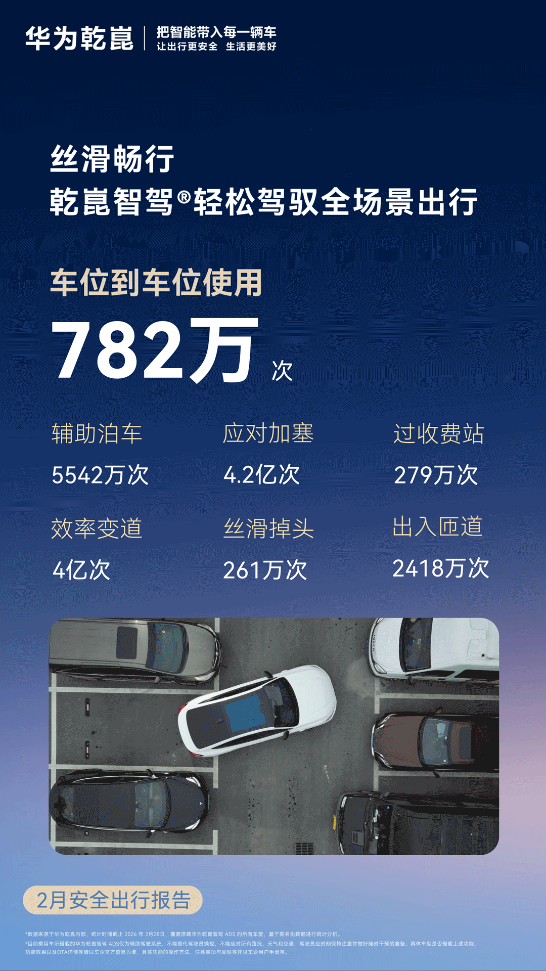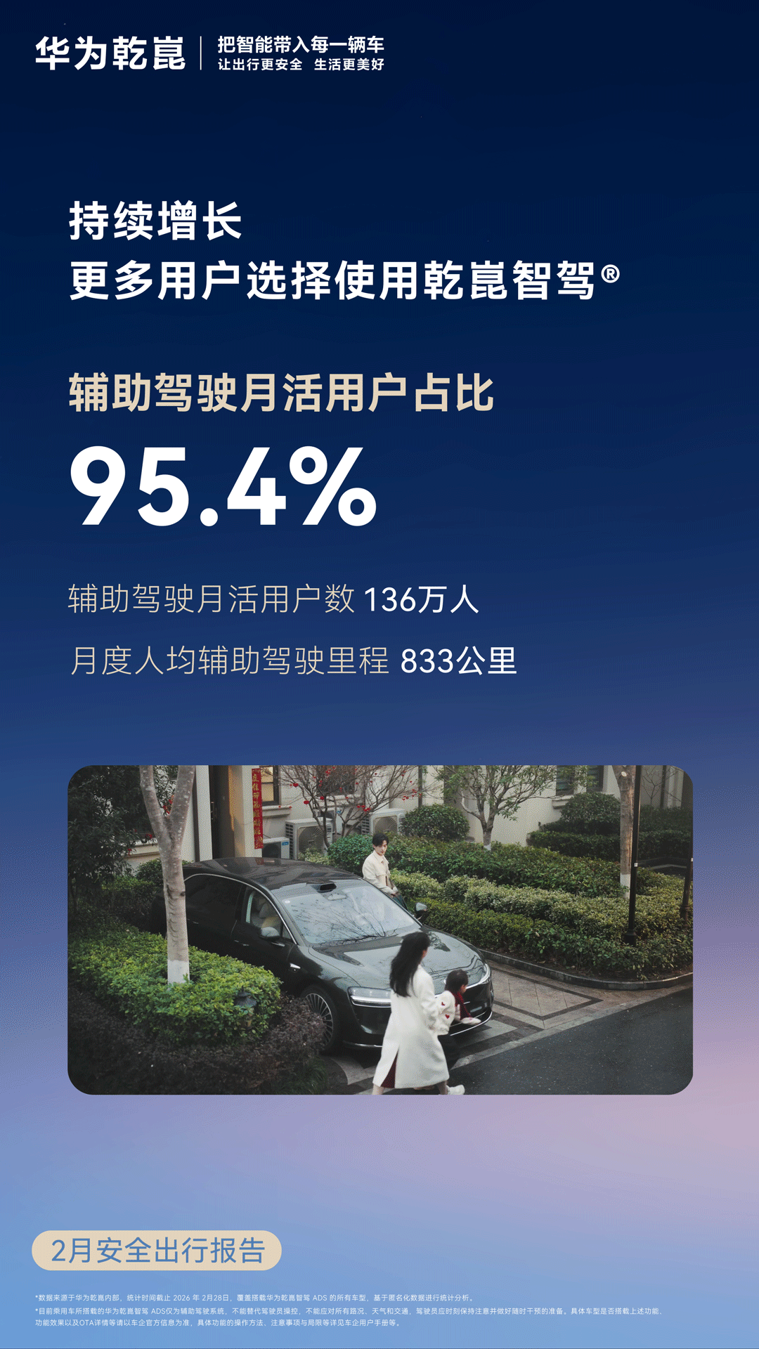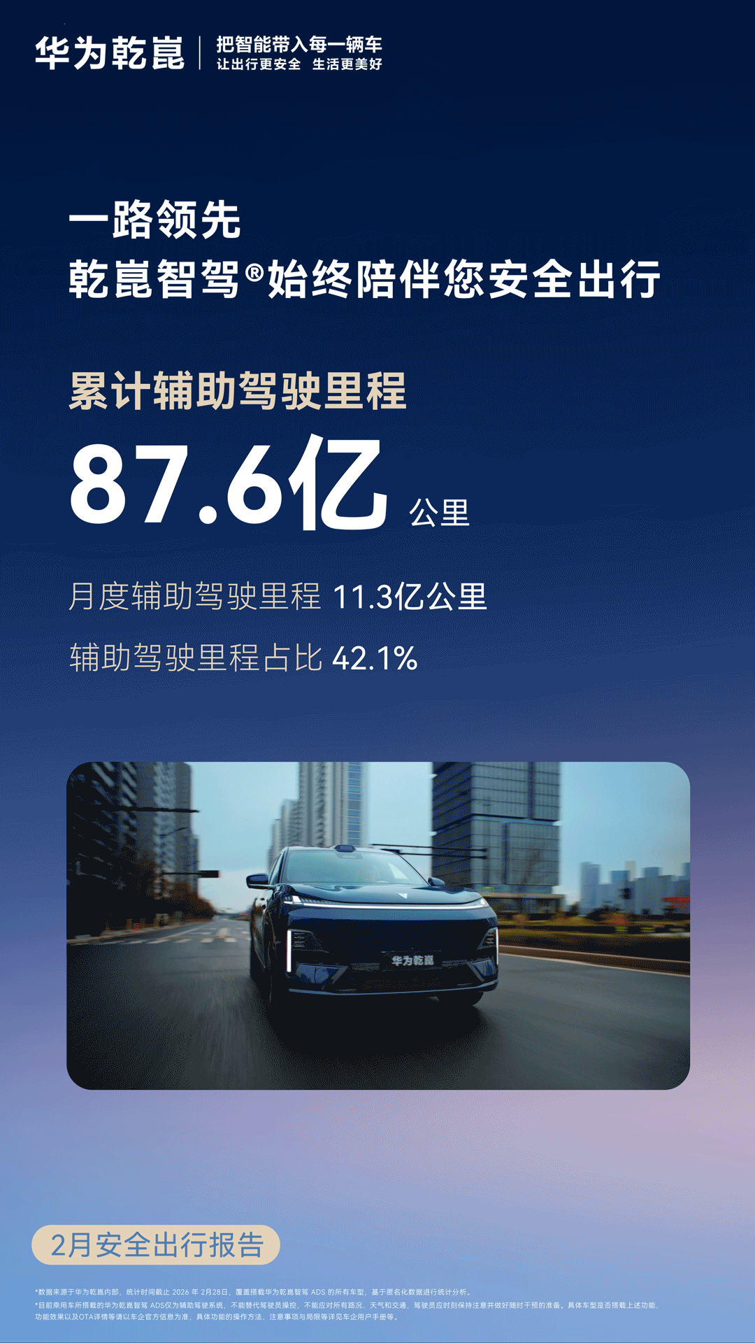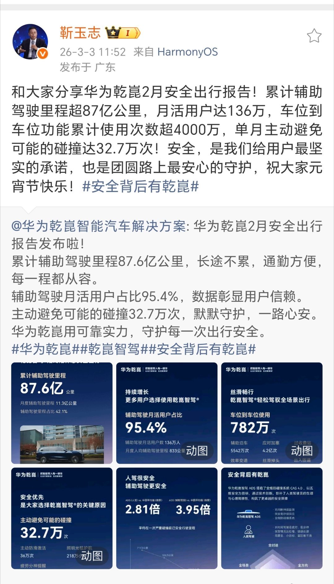 【华为靳玉志分享乾崑 2 月安全出行报告:累计辅助驾驶里程超 87 亿公里,月活用户达 136 万】