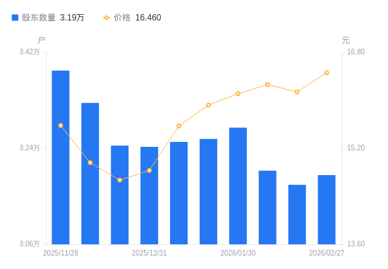 日期A股户数(户)流通A股户均持股数(股)户均持股市值(万元)2026-02-273189712745.3120.982026-02-133171412818.8520.692026-02-103198112711.8320.672026-01-303278612399.7219.982026-01-203257712479.2719.872026-01-093252012501.1419.462025-12-313242512537.7718.592025-12-193244912528.4918.382025-12-103324912227.0518.292025-11-283385512008.1918.71