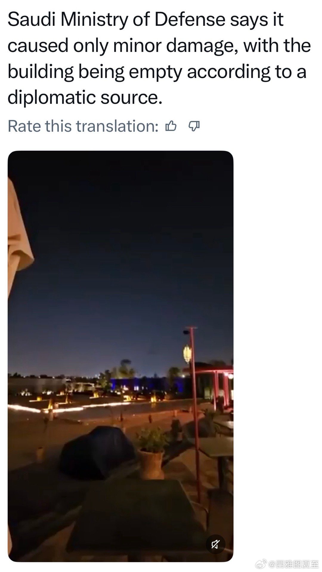 沙特国防部:两架无人机击中🇺🇸驻利雅得使馆没有人员伤亡,因为是凌晨,使馆没人