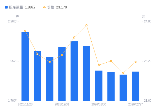 日期A股户数(户)流通A股户均持股数(股)户均持股市值(万元)2026-02-271884311838.8827.432026-02-131865111960.7527.192026-02-101880811860.9127.532026-01-301890411800.6827.192026-01-202045610905.3626.882026-01-092075710747.2225.972025-12-312039710936.9025.652025-12-191977311282.0526.142025-12-102016111064.9325.982025-11-282132410461.4525.56