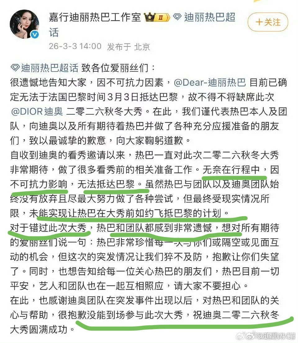 迪丽热巴将缺席时装周迪丽热巴工作室发博:因为转机行程的不可抗力因素无法到达巴黎,缺席迪奥看秀,向粉丝和品牌致歉。之前传买了中转机票而不是直飞所以耽误了行程……这……粉丝不得丝了工作室
