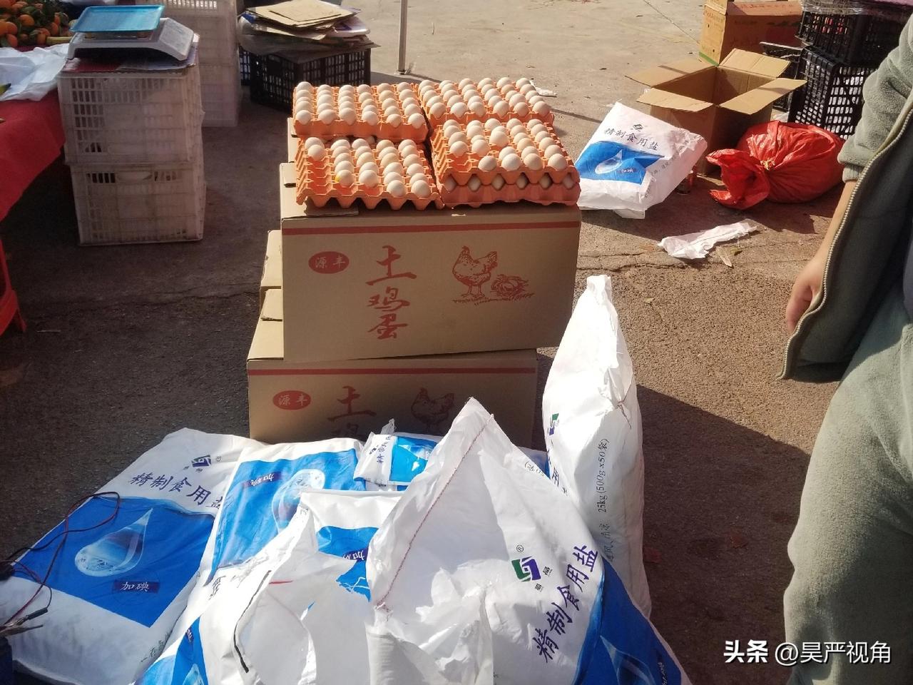 市场管理方为了回馈消费者,每个人可以免费领取三个鸡蛋或一袋食盐。如果是你,这两样