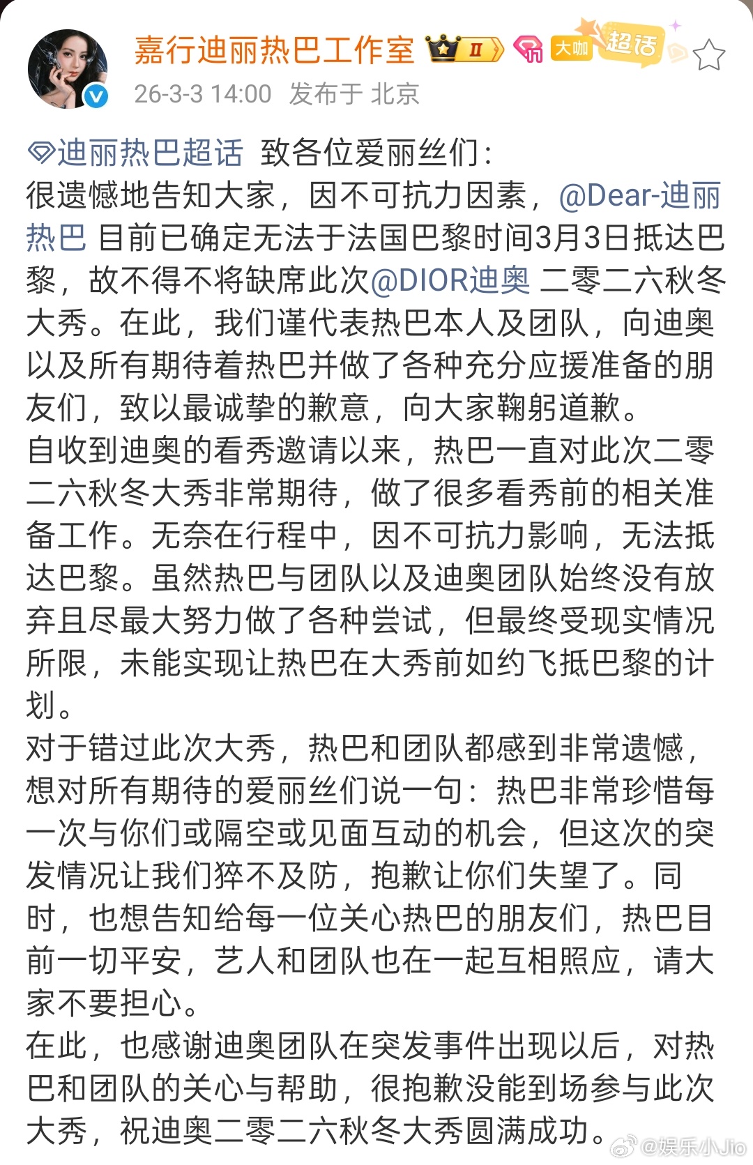 迪丽热巴工作室发文称“因为不可抗力因素,热巴没办法参加3月3号Dior大秀”“虽