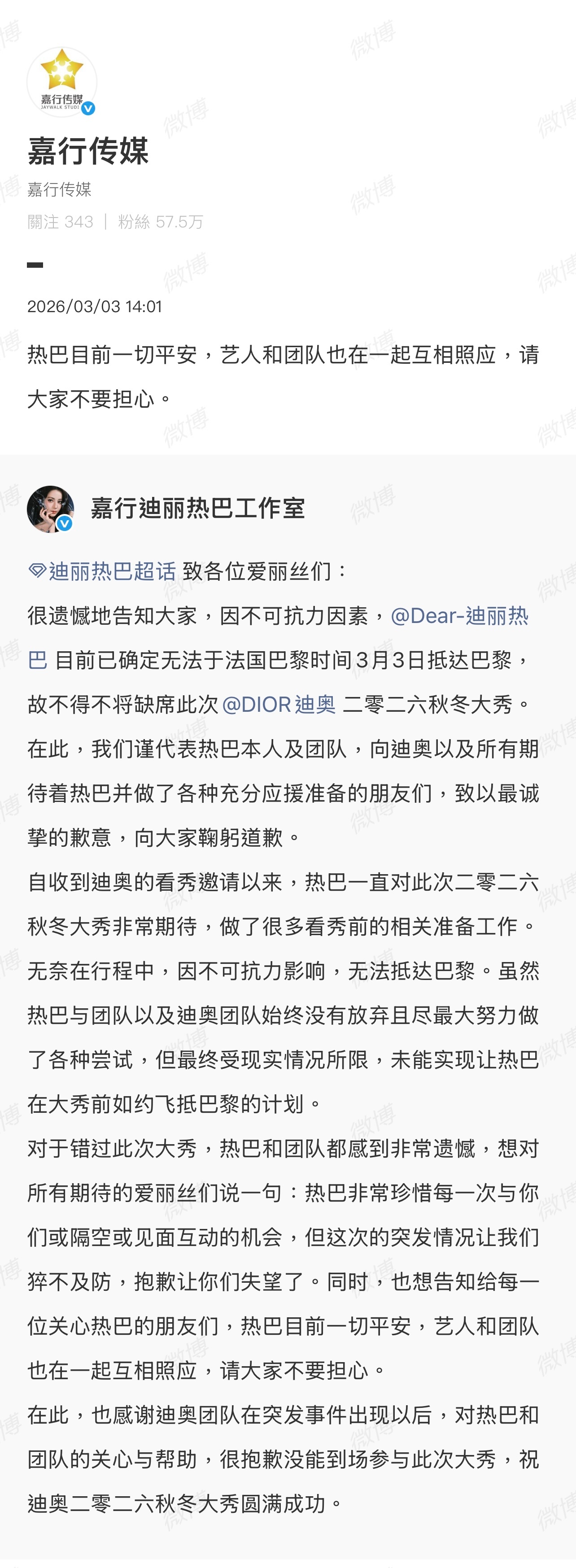 迪丽热巴工作室被粉丝骂了,嘉行说目前迪丽热巴一切平安,一定要注意安全啊,外面太乱了!迪丽热巴将缺席时装周迪丽热巴 滞留迪拜