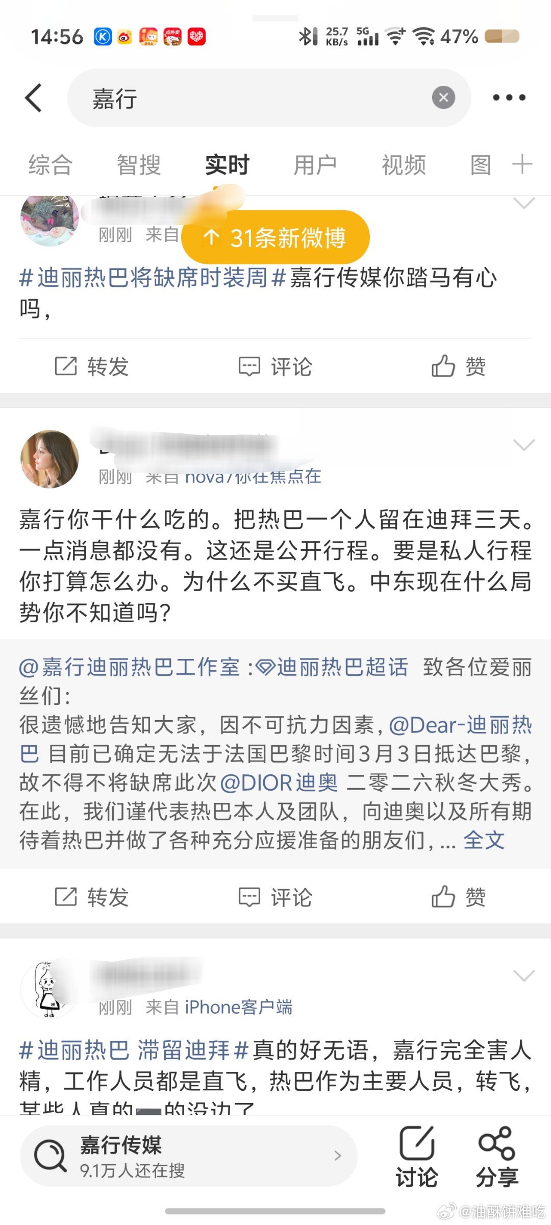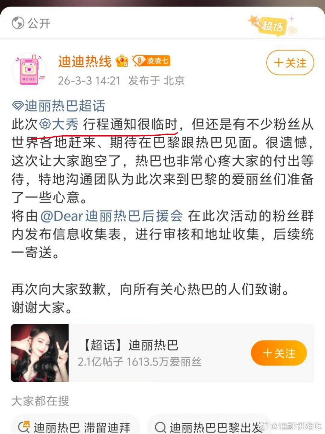 嘉行广场一片骂声了,我还是不理解,如果说这次巴黎时装周Dior大秀行程通知很临时,那为什么热巴要迪拜转机啊,又不是没有直飞……直飞不更快吗理解不了的神操作 迪丽热巴 滞留迪拜