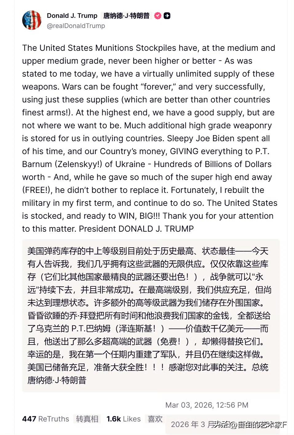 凌晨!睡不着的特朗普发文:美军火用不完,战争可以打一辈子 3月3日凌晨,美国,伊朗,以色列的冲突已经来到了第四天。深夜睡不着觉的特朗普开始发文。强调美国的军火拥有无限量的库存,战争可以永远进行下去,在最高端的武器上美国供应充足,但尚未达到理想状况,伊朗必输,美国必赢。 随后,还顺嘴骂了拜登将大部分的武器援助给了小丑泽连斯基的时候,完全都不知道补充库存。 对于特朗普的这份发言,我们是怎么看的?长夜漫漫特朗普无眠,越是说什么他就缺什么?虽然美国弹药储备量不足,不过好在他们拥有全球最大口径嘴炮,且炮弹无限量供应