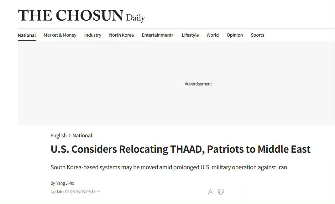 谁还能再说伊朗只炸装备不炸人没用? 韩国的《朝鲜日报》说,美国考虑将部署在韩国的防空装备抽调到阿拉伯国家,填补阿拉伯国家的美军基地装备被袭击造成的损失。 这些装备包括爱国者、萨德、MQ-9“收割者”无人机等监视与侦察装备。 韩国部署萨德引起的中韩争端,转眼已经是十年前了。谁能想到,韩国萨德系统竟然是被伊朗解决掉的。 如果伊朗继续炸美军基地,会不会把驻日美军的装备也调过去?到最后,东亚东南亚的美军变成只剩下单兵轻武器的宪兵队。
