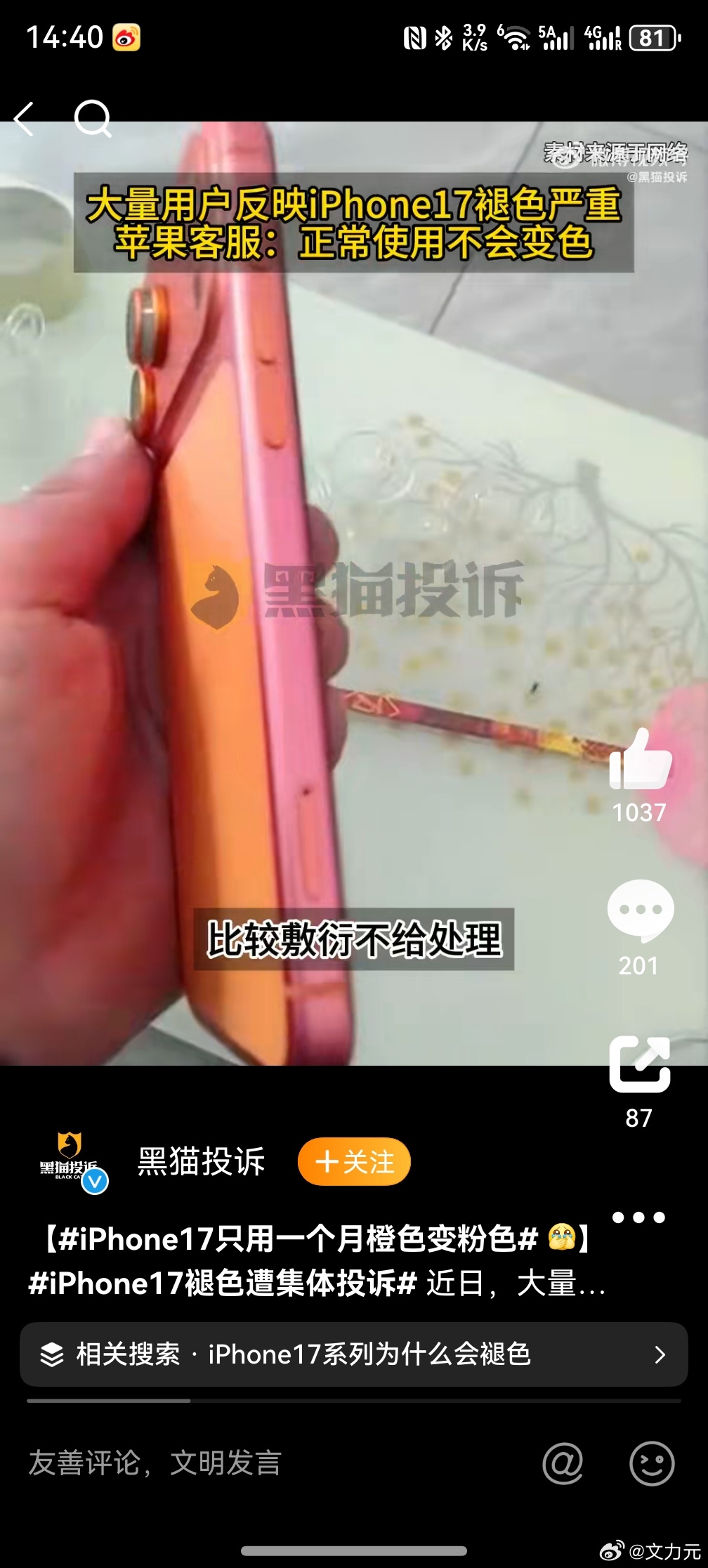 苹果iPhone17只用一个月橙色变粉色 ,难以想象这是这么贵的手机该有的品质吗?如果出在其他厂商身上怕是个大事吧。