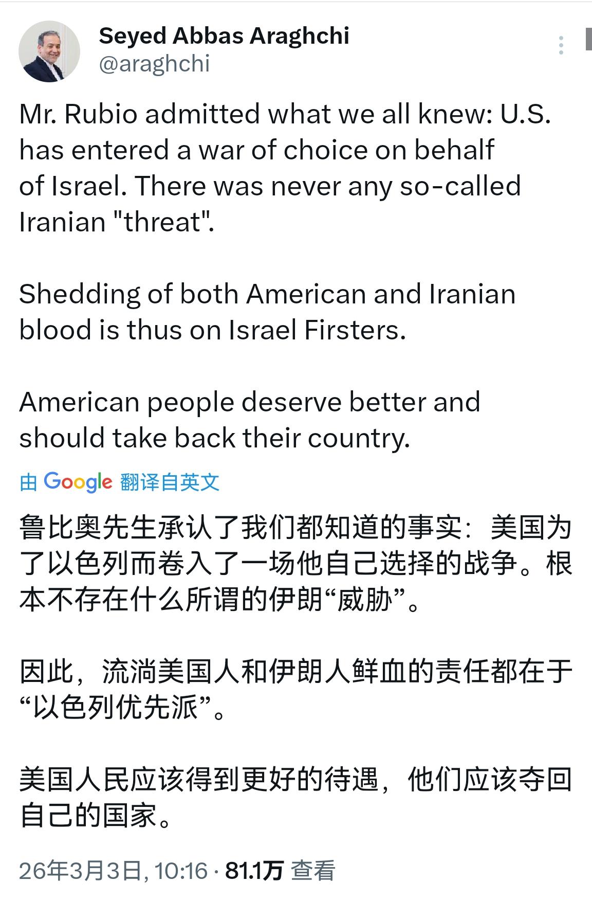 伊朗外长绝妙反击,喊话美国人民夺回自己的国家。 3月3日,伊朗外长阿巴斯·阿拉格齐在社交平台发文,点名回应美国国务卿马尔科·鲁比奥此前关于“美国自愿为以色列参战”的表态。他直言,伊朗从未对美国构成所谓威胁,美国人和伊朗人的流血,应归咎于那些奉行“以色列优先”的人,并且喊话:“美国人民值得拥有更好的,他们应该夺回自己的国家。” 阿拉格齐这番话其实分量不轻。 首先,阿拉格齐是借鲁比奥自己的话,拆掉美国“被迫自卫”的叙事根基。既然是“自愿参战”,那所谓的安全威胁就站不住脚。用对方官员的表态反击对方,这是最难反驳的一种打法。 其次,将美国政府和美国人民做了精准切割。他没有攻击“美国”这个整体,而是把矛头对准少数政客,把美国政府与美国民众区分开来。逻辑很清楚:不是美国人民要打仗,而是有人把美国拖进战争。这样一来,美伊之间的外部冲突,被巧妙转化成美国内部的政治争议。 再者,这就是以彼之道还施彼身。过去美国政客常说“某某政权不代表人民”,鼓动他国内部变局。如今阿拉格齐把同样的话术送回美国——“美国人民应该夺回自己的国家”。如果华盛顿指责这是干涉内政,就等于否定自己长期使用的舆论工具。 阿拉格齐全程站在“反对无谓流血”的立场上,没有一句威胁性语言,却把责任全部推回发动战争的一方。这种表达方式既避免了升级风险,又在道义层面占据主动。 这场反击,看似平常,实则火力十足。对于当下本就撕裂的美国社会而言,这种“把话递到你家门口”的打法,杀伤力远比强硬叫阵更大。