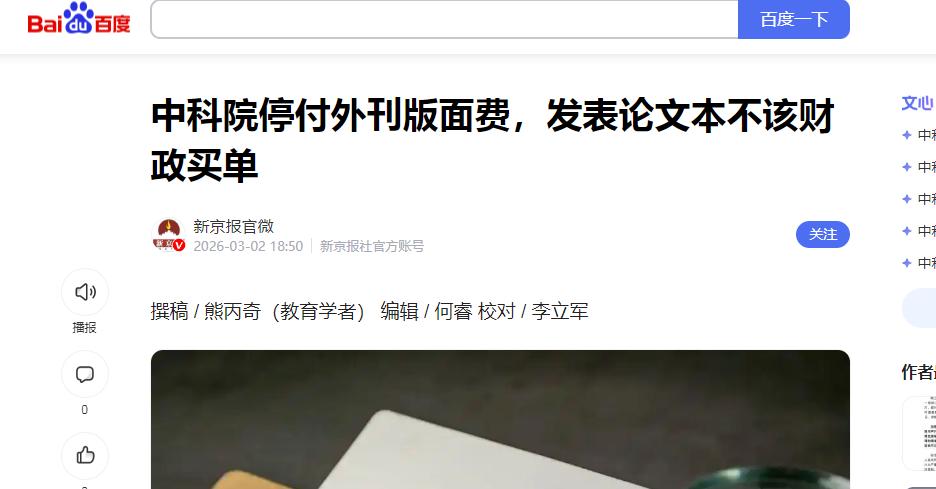中国科学院正式打响了反击第一枪!面对国际期刊所收取的天价版面费,我们不交了。2026年3月1日,中国科研界出了件大事,中科院正式宣布,停止为30种国际高价期刊支付论文发表费用。 咱们先来一句开场白:科学不是卖钱,而是创造未来。 其实,真不只是吐槽那么简单。这事儿背后牵扯的利益太大太深。 怎么讲?梳理一下现在的局面:过去好多年,做科研、发论文,大家都习惯于往国际顶级杂志投,尤其是开放获取的那些大期刊。 像什么自然通讯、细胞报告、科学进展这些,每一篇文章的版面费,狮子大开口,基本都在5000美元以上,有的甚至涨到了7000多美元。 折合人民币,普通人看了都直吸冷气,发一篇论文一辆家用轿车“没了”,而且2026年,这些期刊还要集体涨价。这合理吗? 难怪有人说,发表科研成果这事儿已经不再单单考验学术能力,更是资金实力的比拼了。 可以说,西方出版商通过所谓的开放获取,把“知识传播”扭曲成了赤裸裸的商业收割。 更坑爹的是,这些高价期刊的审稿,大多还是全球各地的科学家义务劳动。 出版社只负责印刷和发布,利润却高得惊人。 咱们得认清楚现实:我国科研人员做着世界级的研究,用国家经费、中央财政支持,往往成果一出来却还得再掏钱“送出去”,知识产权拱手让人。 西方期刊再把这些论文打包卖回给全世界,哪个环节都没自己亏,大把大把赚钱。 这种模式对谁有利?但凡用点脑子想想,都明白:最大赢家肯定不是我们。 可长久以来,国内“唯西方顶刊”的风潮十分严重。 只要你进名刊,无论晋升、评职称还是项目立项都畅通无阻;投本土或者普通期刊,哪怕内容价值同等甚至更高,也常常得不到同样重视。 构成了一种怪圈:就是得迎合西方规则,才能在国内混得开。 每逢职称评选、项目申报,没有几篇国际大刊“护体”,感觉就不够硬气。 这是不是有点不公平?归根到底,不合理的游戏规则绑架了我国科研评价体系,让“发顶刊”变成几乎唯一的成功之路。 这一次,中科院直接给高价顶刊“断奶”,也是在为中国科研正名。 政策不是说禁止大家国外发论文,而是明确:别再用国家的钱给国外做大买卖了,该省的钱必须省,而且必须用到刀刃上。 谁个人愿意掏腰包投这些期刊,还可以;但动用国家和院内经费,那是要卡住的。 有些人质疑,说中科院的政策会不会让我们的科研成果被“边缘化”?国际话语权会不会被进一步压制? 其实,真的没必要过度焦虑。首先,真正有影响力的研究,就算不发在顶刊,也会被全球认可。 比如近几年我国的量子通讯、人工智能这些,就算不靠西方大刊背书,国际学术界同样刮目相看。其次,我们其实早就在未雨绸缪。 2019年,我国正式启动世界级科技期刊建设计划,目标是到2025年前后,打造400种有全球影响力的中国本土期刊。 到2023年为止,这个蓝图已经进展很不错,比如本土的英文开放获取期刊数量已经有178本,有一半还不收任何版面费,直接让科研成果发布“零负担”。 以国家科学评论为代表的一批本土期刊,影响力越来越大,咱们自己的审稿流程、公平公正,慢慢掌握越来越多的主动权。 我们也不是盲目自信,是真有底气。 你可能想不到,2025年《自然通讯》《科学进展》这类顶刊,差不多有10%的作者是中科院的科研人员,中国作者总占比能到40%左右。 换句话说,没有中国,很多顶刊影响力直接腰斩。 这也很好解释,为什么中科院一宣布新政策,国外期刊商直接坐不住了,媒体四处打探动向。 这不是危言耸听,这是事实。 更重要的,是我们对学术诚信的要求一直在加强。 前些年,各类预警名单频繁发布,超120种存在科研诚信问题的“水刊”“假刊”,也早被禁止用任何经费走报销流程。 避免了科研评价体系被乱象污染。 国内发挥带头作用,国外其实也早有反思。 比如德国,对版面费做过明确规定,基金会不给付超高费用;美国国立卫生研究院也在考虑限制高价期刊的报销资助。 西方自己内部都逐渐觉得天价商稿难以为继。中科院这次只是加快了推倒“旧山头”的速度。 国内呢,这次中科院决策的深层价值其实不止“省钱”这么浅显,更重要的是直接割裂了长期资本依赖。 科研不是用来给西方期刊赚钱的,也不是拍马屁讨好国外同行的,更不是单靠发几篇大刊来论英雄的事。 我国科技实力崛起到现在,不能再让如此不公正的利益链条压在头上。 我们不可能永远做“打工仔”,扫地出门的也未必会比原来差。 参考:新京报官微—— 中科院停付外刊版面费,发表论文本不该财政买单