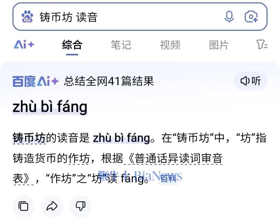 与此同时,“百度AI搜索”还附上一张配图,显示搜索“铸币坊读音”,百度AI给出结论为“zhùbìfáng”。